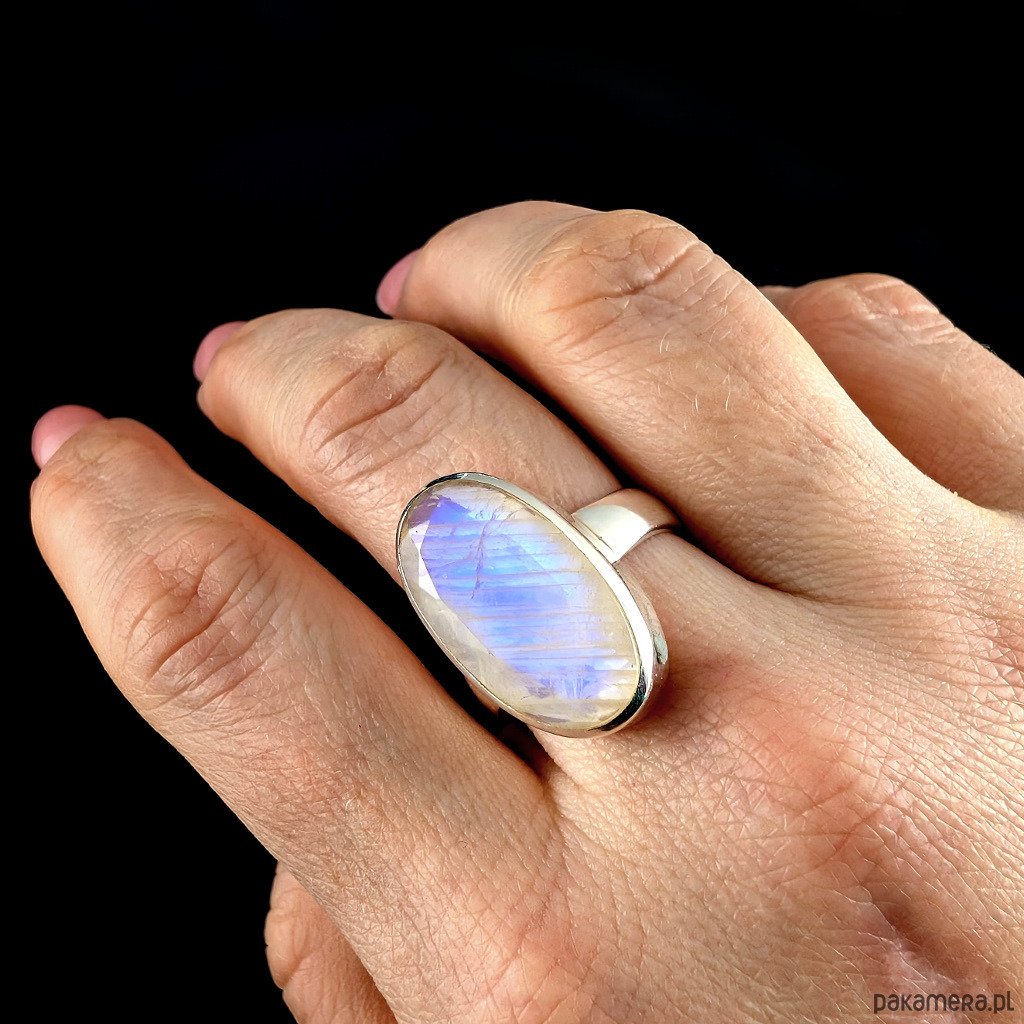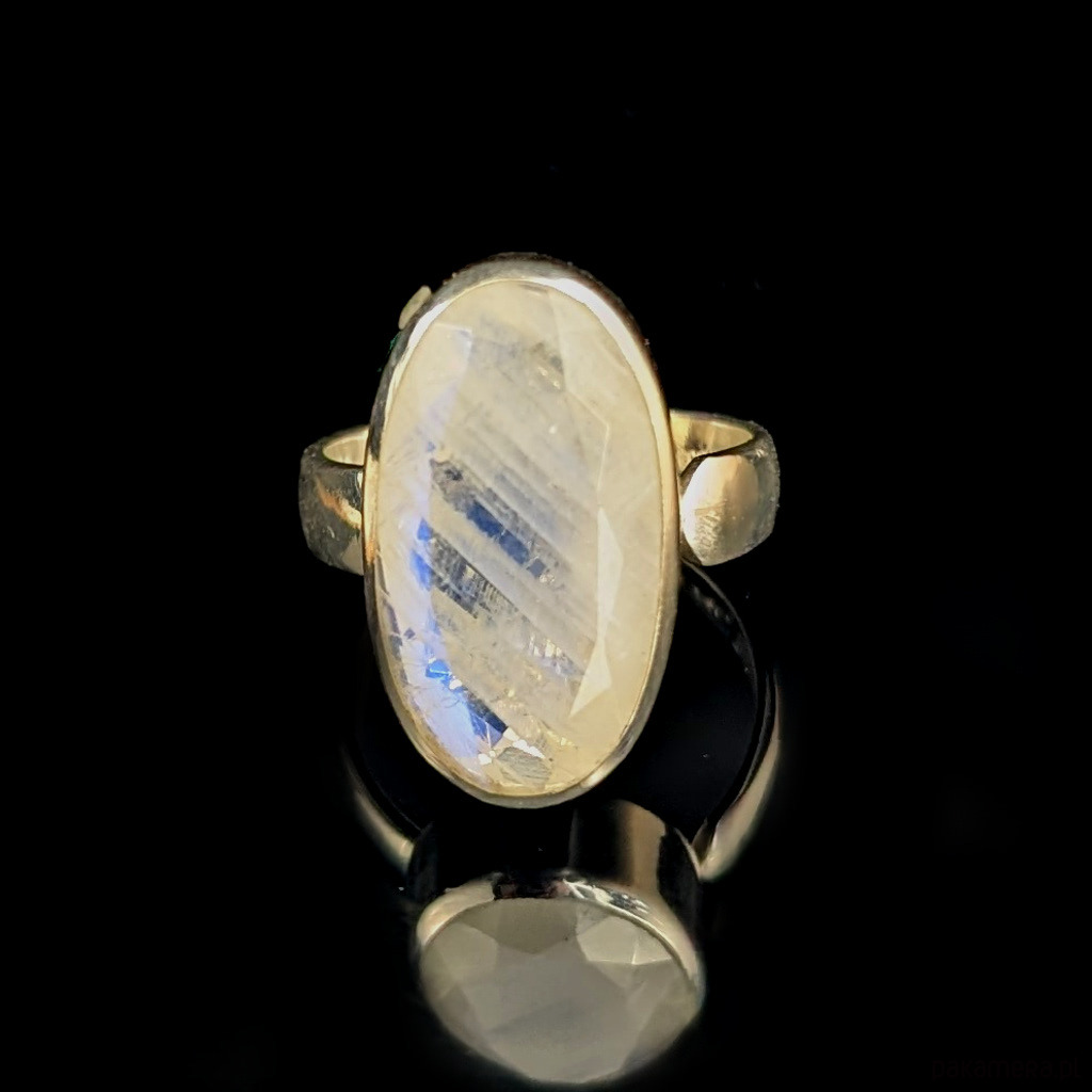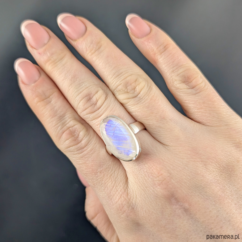 Pierścień z oprawionym w srebro próby 925 pięknym kamieniem księżycowym o błękitnej poświecie . Szerokość obrączki 5 mm. Kamień ma oprawę 22x 14 mm. Rozmiar jubilerski regulowany w wąskim zakresie 14-19, po zakupie dopasuję do odpowiedniego rozmiaru. Waga 8.4grama. Wykonany przez dostawcę kamieni, Pierścień zapakowany zostanie w ozdobne pudełeczko.