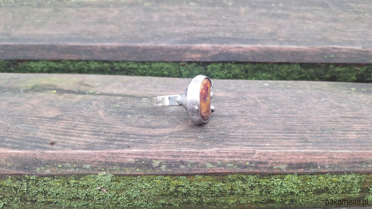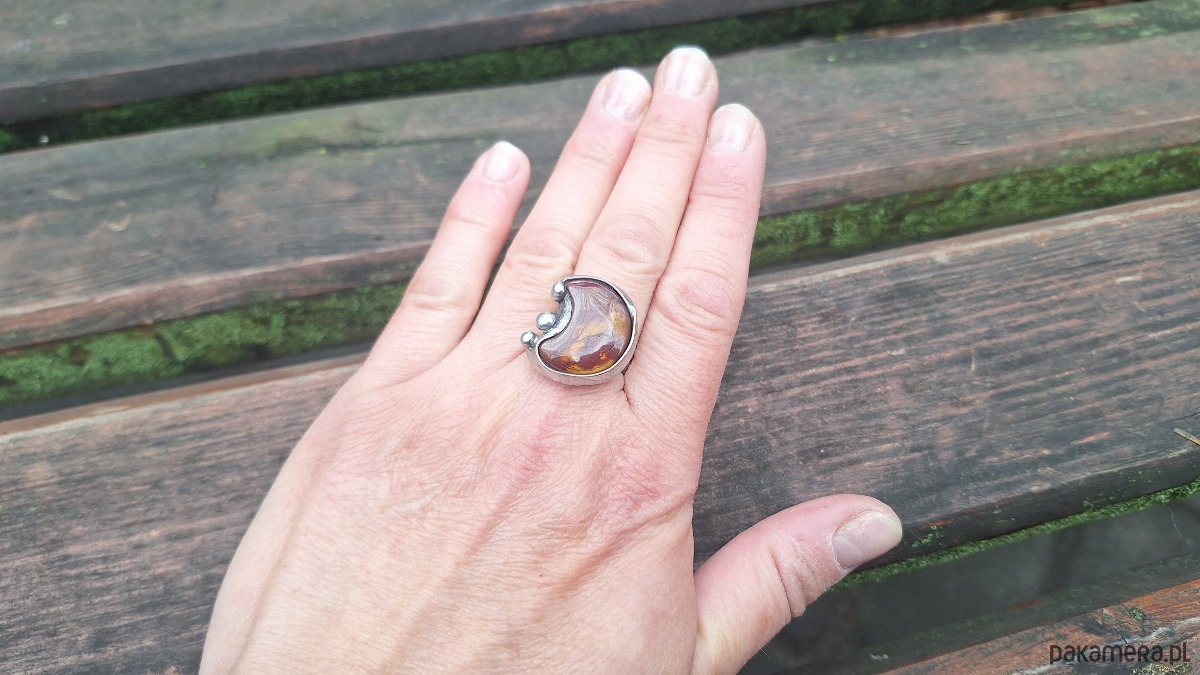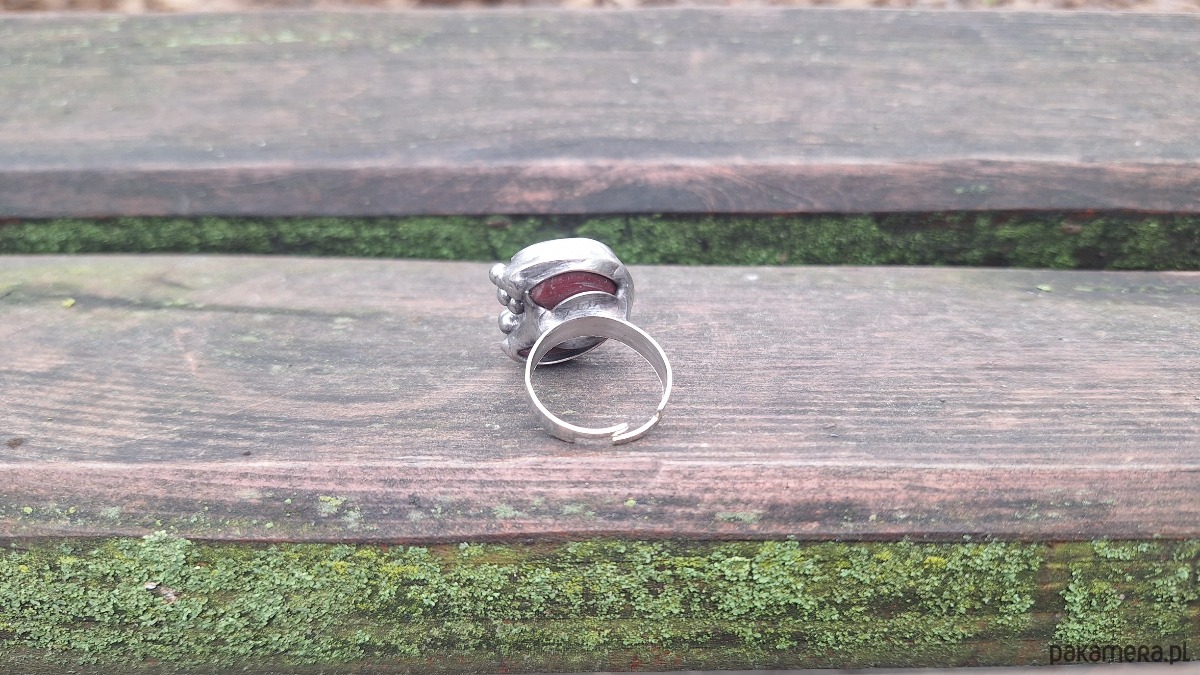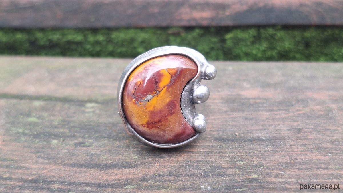 Pierścionek wykonany z miedzi, cyny i jaspisu mokaitu. Wymiary ok. 2 na 2 cm. Regulowany. Nie jest ciężki. Kamień posiada miejscami naturalne niedoskonałości.