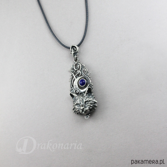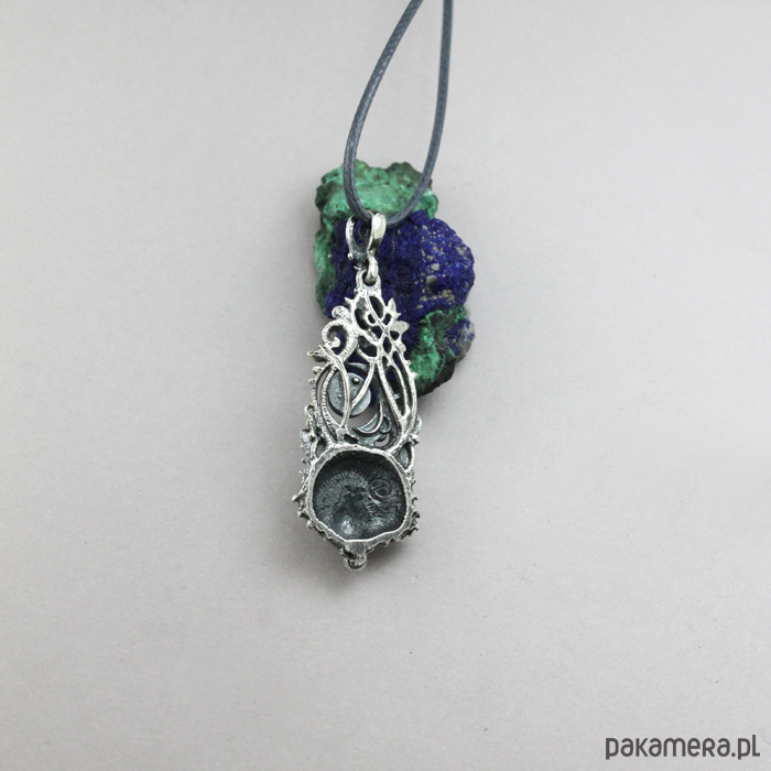 Niewielki, ażurowy wisior, pełen zadziwiających detali, zaprojektowany przeze mnie od podstaw ręcznie, wykonany ze srebra pr. 925, zdobiony kaboszonem lapis lazuli, w kolorze nocnego nieba (4 mm). Stanowi część mojej kolekcji symboli, celebrujących naszą więź z Naturą.