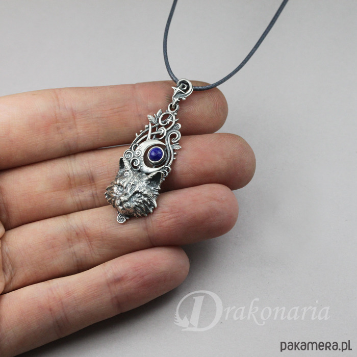 Każdy detal tej pracy - elementy maleńkiego kociego portretu, pnącza z maleńkimi listkami, gwiazdki -zostały wyrzeźbione przeze mnie ręcznie a następnie odwzorowane techniką wosku traconego. Wisior oksydowany i polerowany.
