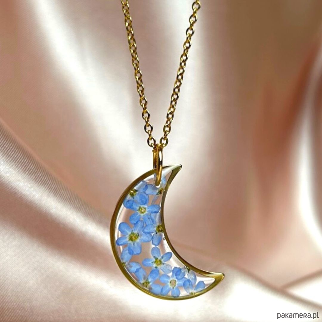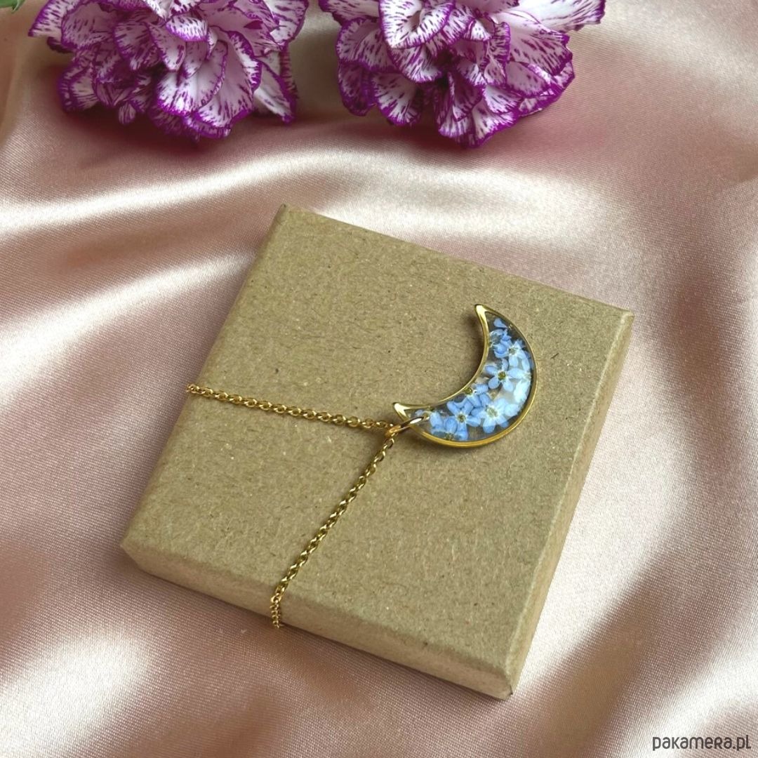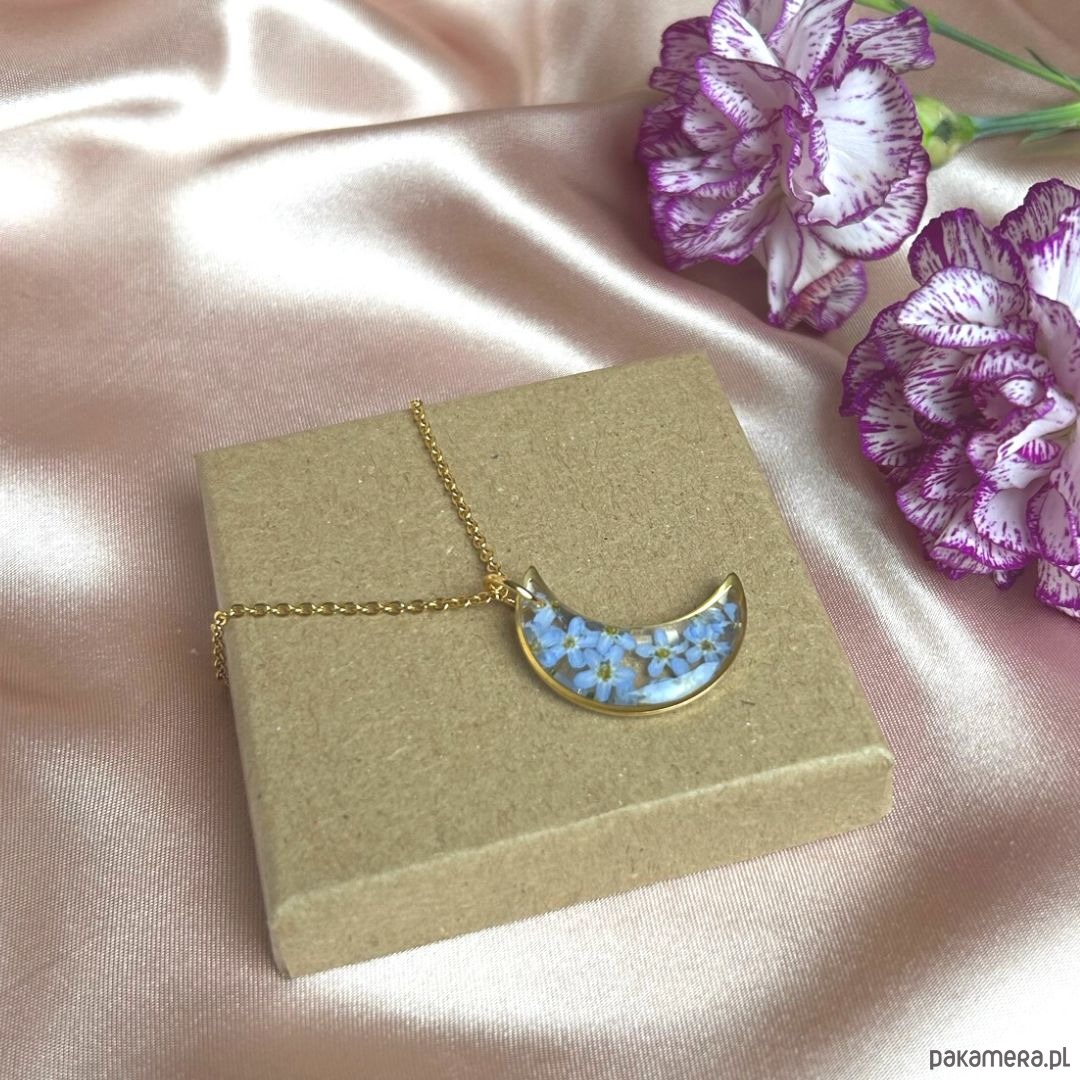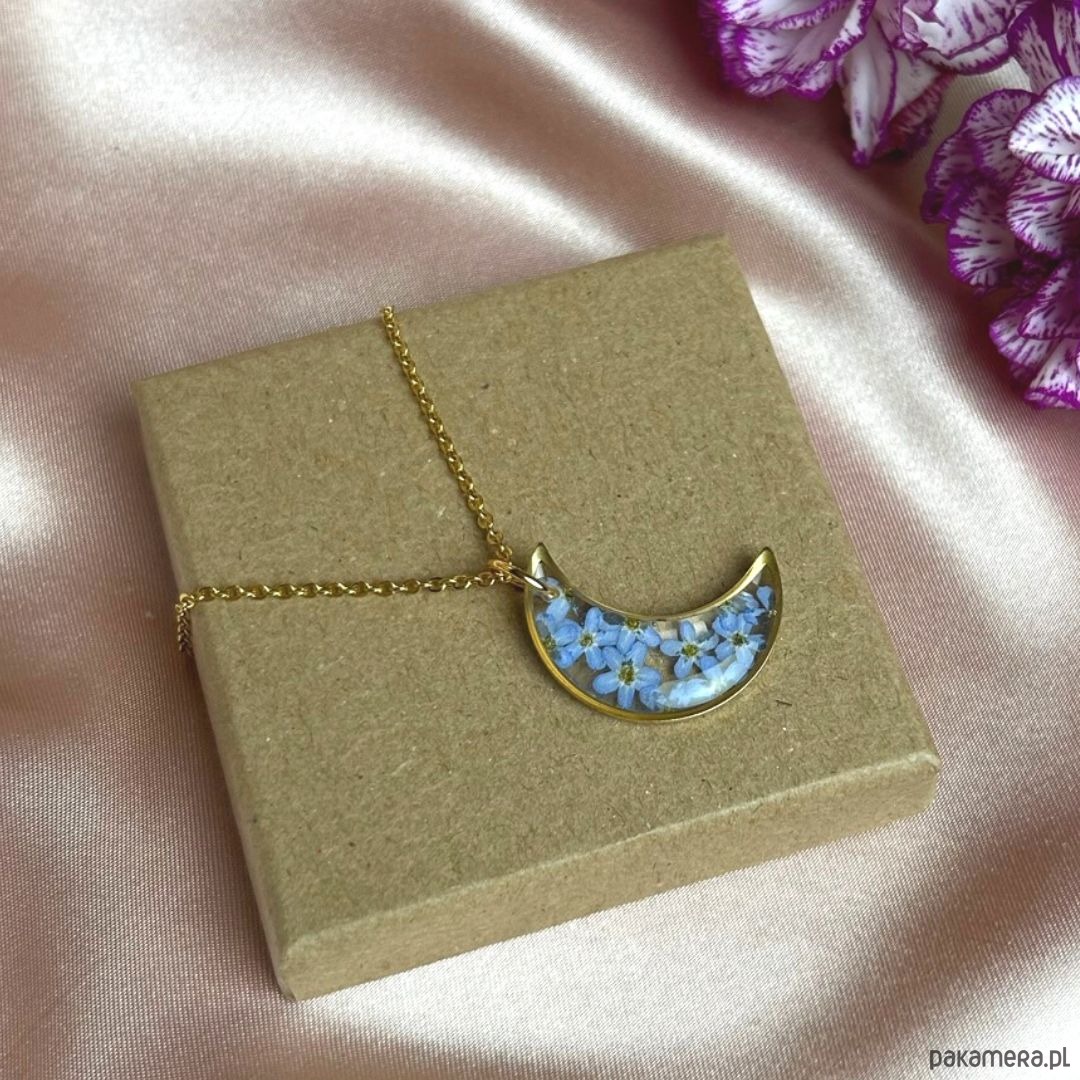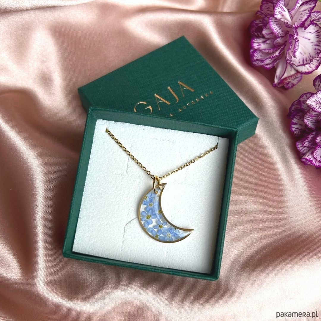 Przedstawiam księżycowy naszyjnik z prawdziwymi kwiatami niezapominajki zatopionymi w krystalicznej żywicy .Jest to unikatowy naszyjnik wykonany ręcznie z największą starannością w pracowni Gai. Taka biżuteria może być idealnym prezentem dla Siebie lub ważnej dla Ciebie Kobiety, która ceni sobie elegancje oraz bliskość natury. Naszyjnik zostanie zapakowany w ekologiczne pudełeczko na biżuterię, posiadające certyfikat FSC.