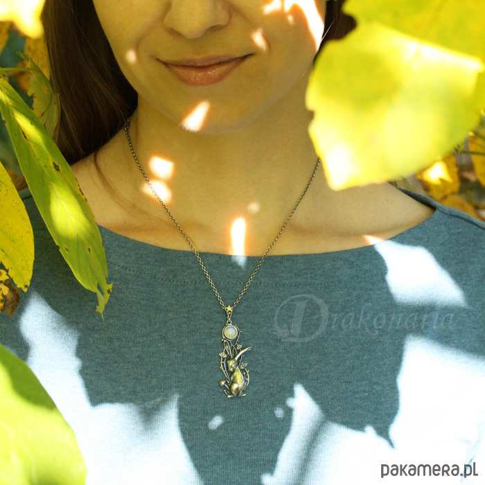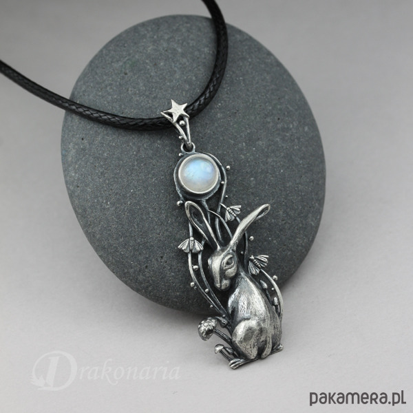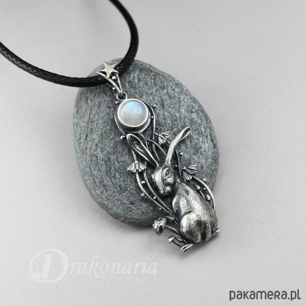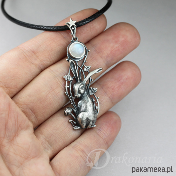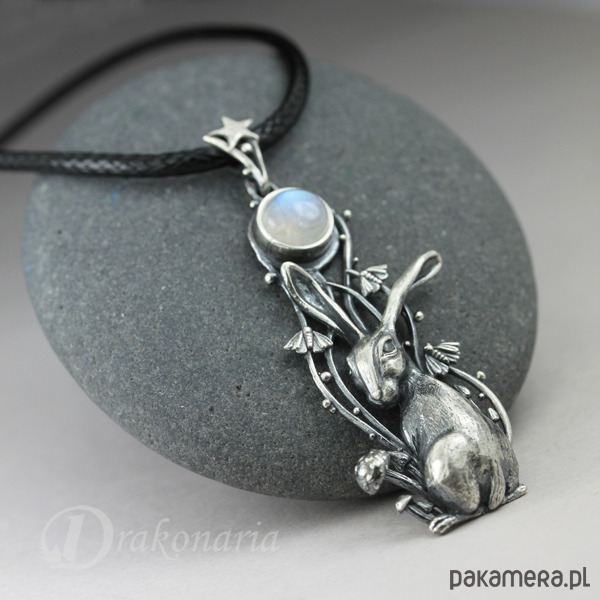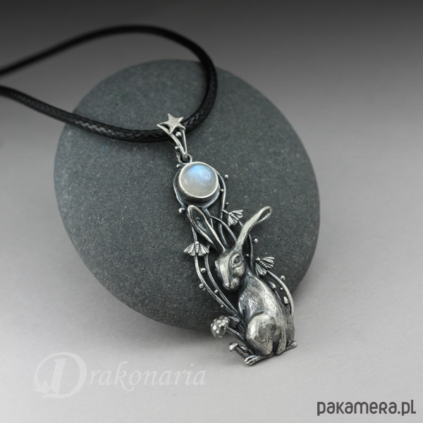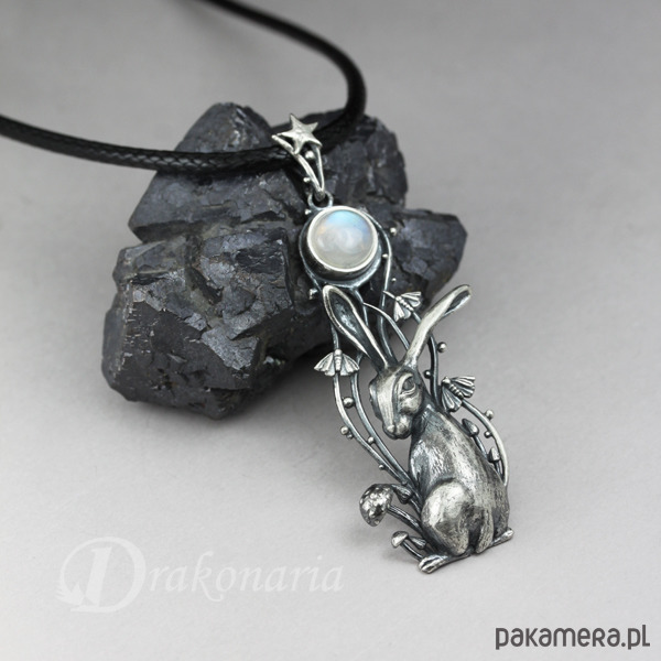 Wisiorek przedstawia maleńkiego zająca i Księżyc w pełni - symbol obecny w wielu kulturach, praktycznie na całym świecie - od Chin poczynając, poprzez Indie, Amerykę Południową i Środkową, na Wyspach Brytyjskich i wielu krajach Europy kończąc. Księżycowy zając kojarzony jest z siłami życiowymi i odrodzeniem, ale także magią, przekraczaniem granic między światami i tajemnicami nocy. Zające często bywają mylone z królikami, ale w przeciwieństwie do nich są istotami bardzo niezależnymi, tajemniczymi indywidualistami, gotowymi do zaciekłej walki (potyczki zajęcy są niezwykle dynamiczne i widowiskowe). Mój księżycowy zając to zdecydowanie postać z charakterem widocznym na maleńkim pyszczku. Wpatrywał się w Księżyc, otoczony niezwykłą, nocną sceną, ale zaalarmowany jakimś odgłosem, właśnie obraca się w stronę patrzącego.