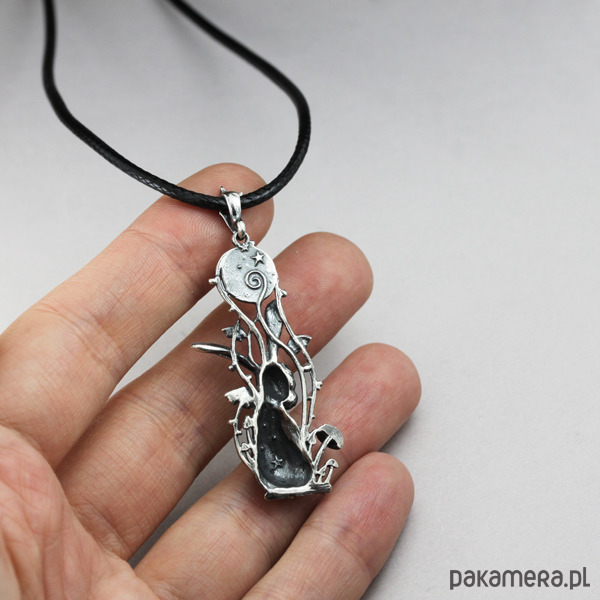 Niewielki, ażurowy wisior, pełen zadziwiających detali, zaprojektowany przeze mnie od podstaw ręcznie, wykonany ze srebra pr. 925, zdobiony pięknym kamieniem księżycowym o wielkości 7 mm. Stanowi część mojej kolekcji symboli, celebrujących naszą więź z Naturą.