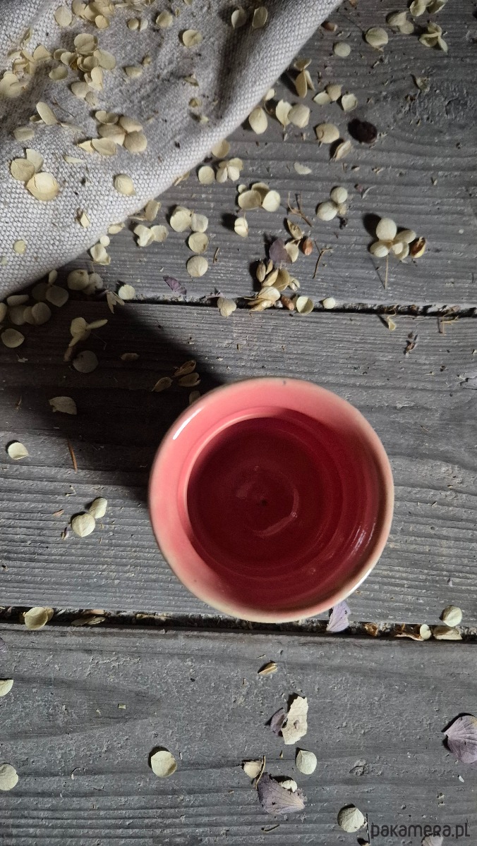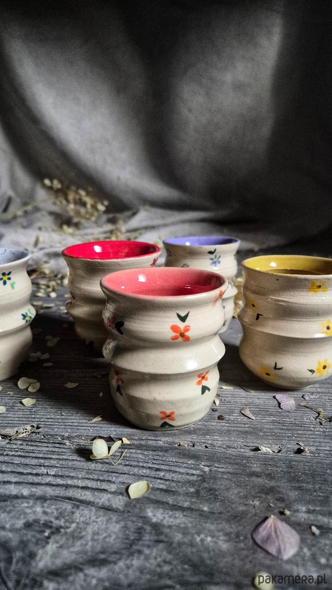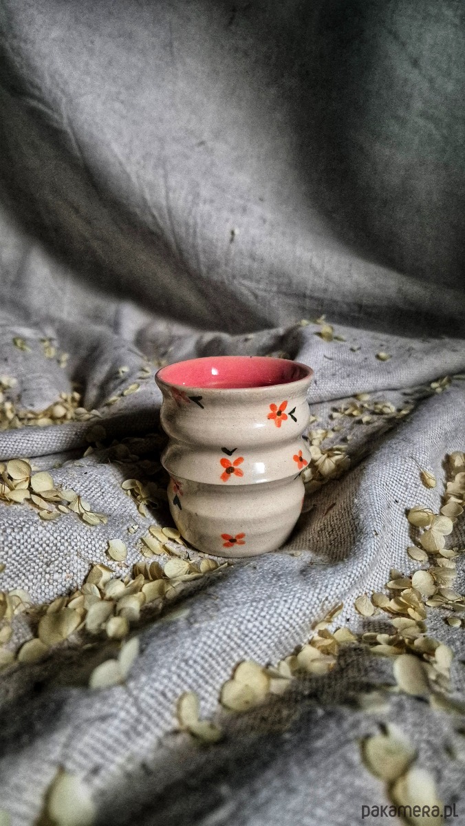 Wiosenna czareczka, ok. 80 ml w malowane ręcznie kwaitki. Wnętrze różowe. Kubeczek, wiosenny retro na codzienny rutuał przy małej kawie, herbacie lub naparze z ziół. Kolorowa czarka z wiosennymi elemnatami, jedyba w swoim rodzaju, malowana w 100 procentach ręcznie. Wyskość ok. 7 cm. Czarka toczona w wymyślny kształt, nastepnie wypalana na biskwit na 950 stopni, później 1230 stopni, co zapewnia pełną odporność na wodę i wytrzymałość w użytkowaniu.