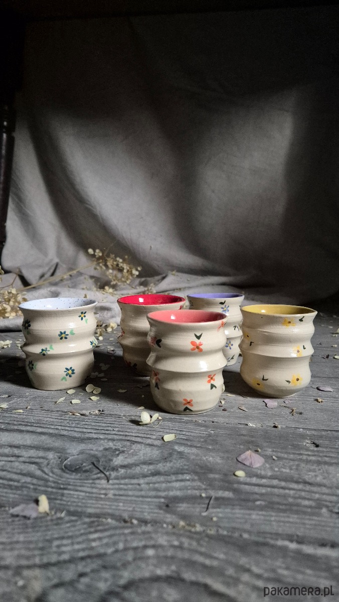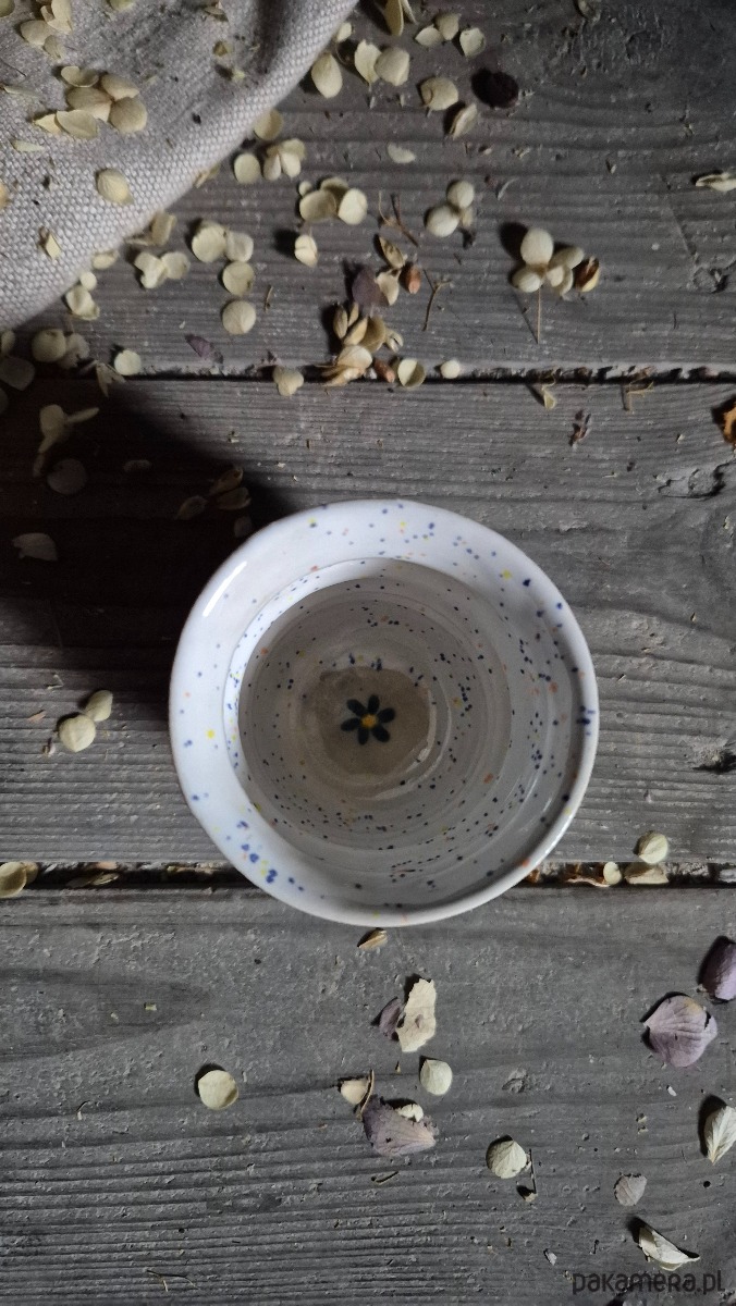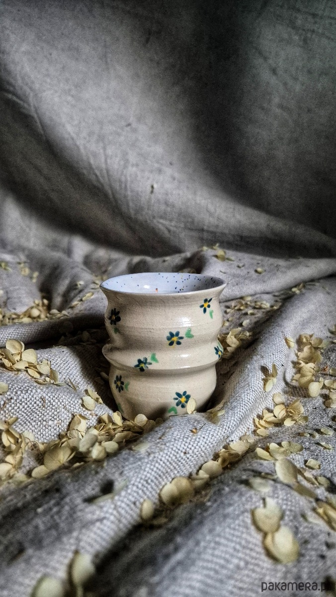 Wiosenna czareczka, ok. 80 ml w malowane ręcznie kwaitki. Wnętrze niebieskie. Kubeczek, wiosenny retro na codzienny rutuał przy małej kawie, herbacie lub naparze z ziół. Kolorowa czarka z wiosennymi elemnatami, jedyba w swoim rodzaju, malowana w 100 procentach ręcznie. Wyskość ok. 7 cm. Czarka toczona w wymyślny kształt, nastepnie wypalana na biskwit na 950 stopni, później 1230 stopni, co zapewnia pełną odporność na wodę i wytrzymałość w użytkowaniu.