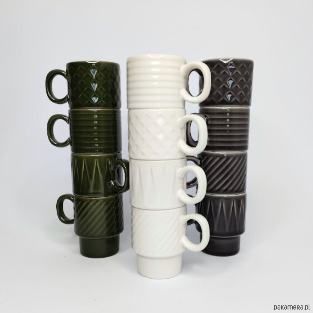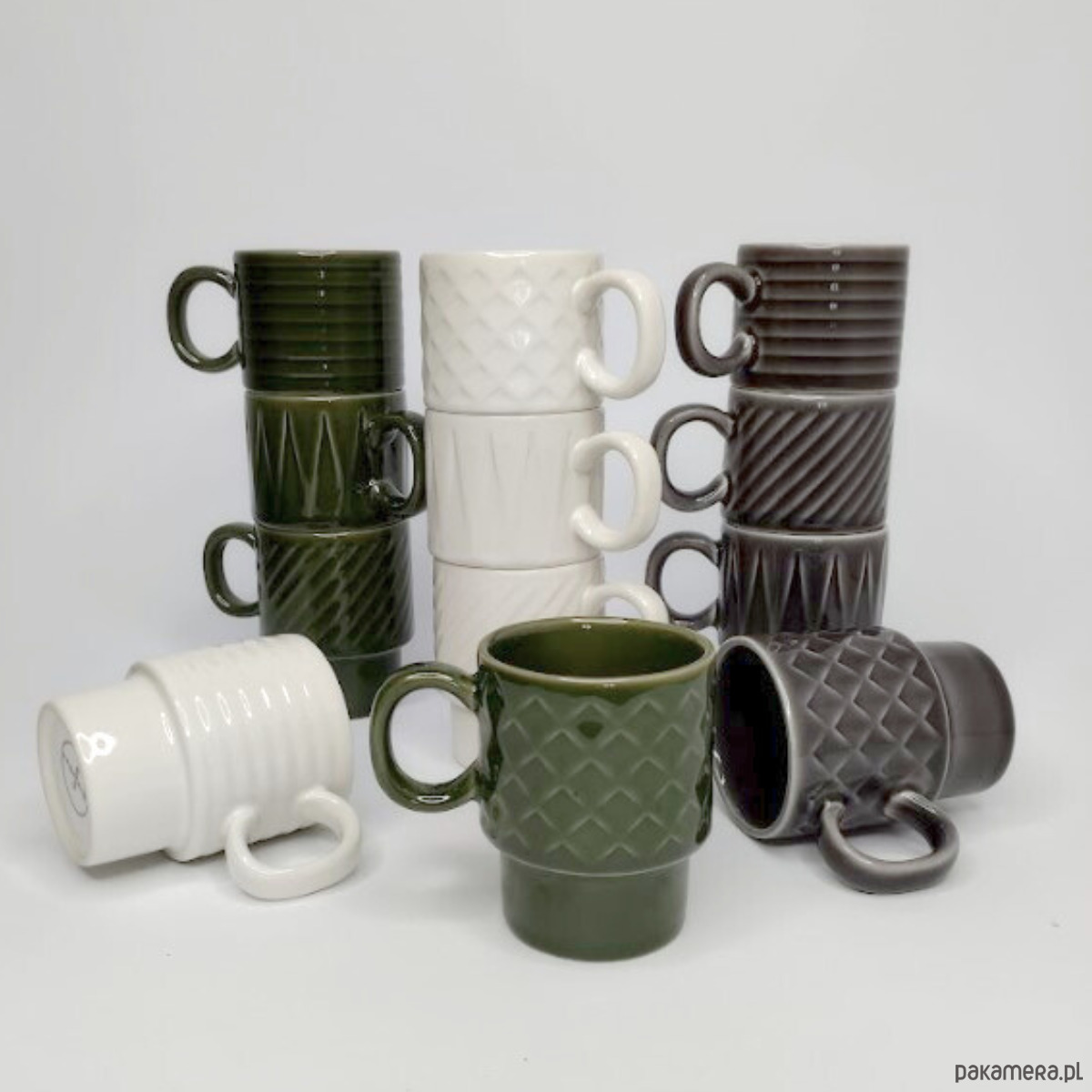 każdy kubeczek ozdobiony jest innym wzorem: kratka, jodełka, paski, trójkąty