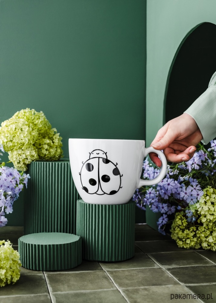 Bardzo duży biały kubek na kawę i herbatę dekorowany ręcznie według autorskiego projektu.