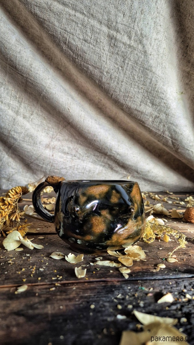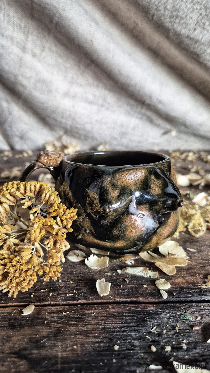 Cycuszki kubek ciemna butelkowa zieleń. 200 ml pojemność kubka. Na rękojeści kubka mała rzeźba ciasteczka. Kubek toczony na kole, cycuszki recznie dorzeźbiane. Można myć w zmywarce. Wypał 1230 stopni.