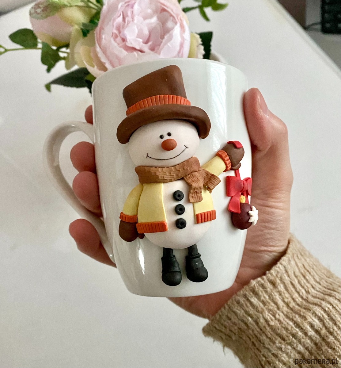 Kubek 2D z dekorem z gliny polimerowej świąteczny bałwanek