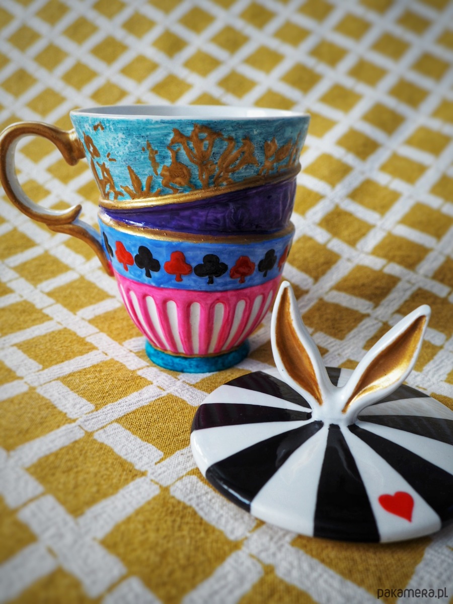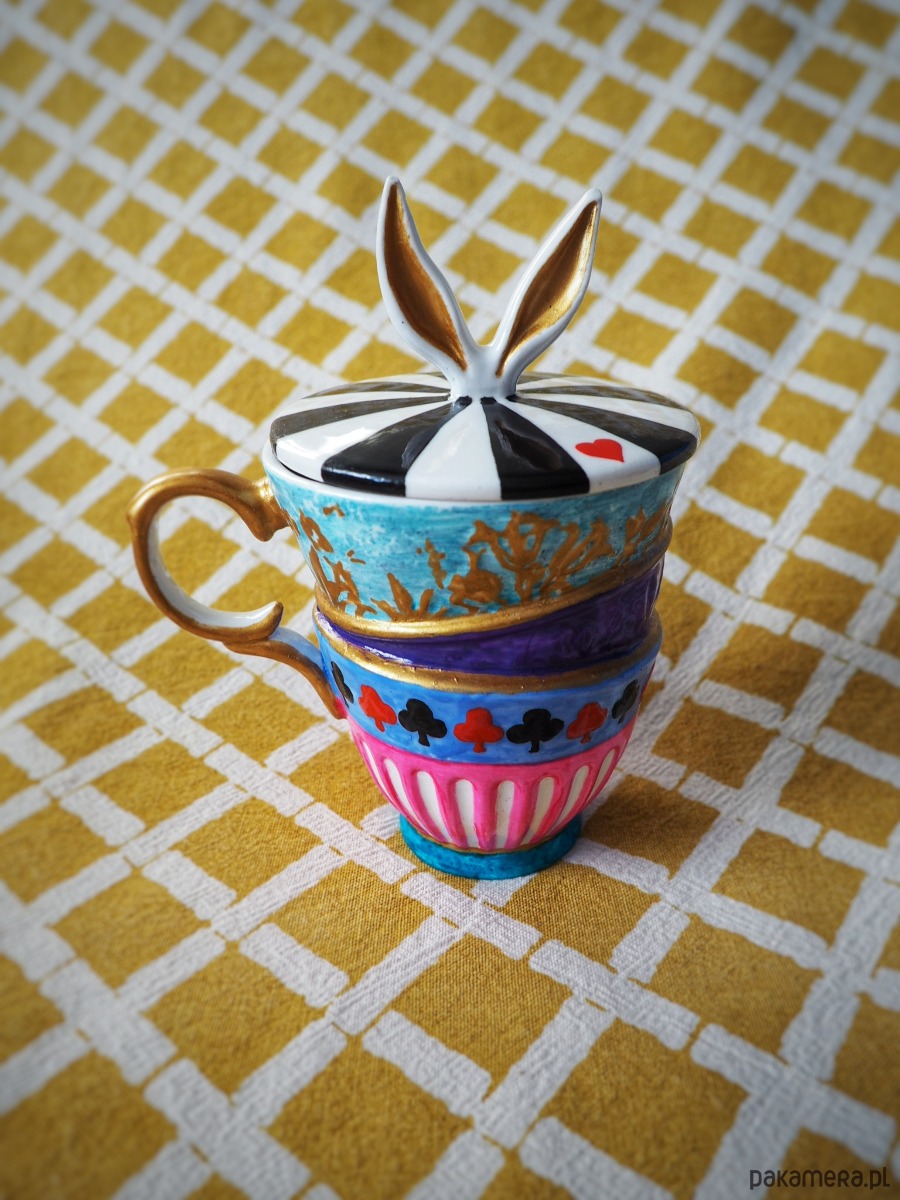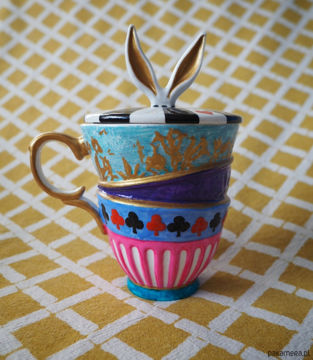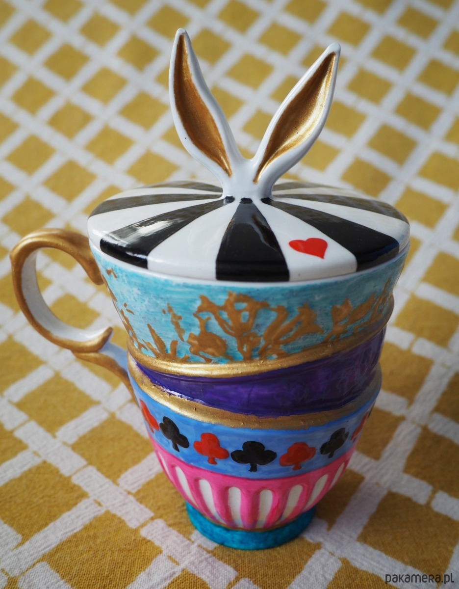 Idealny na podwieczorek z Szalonym Kapelusznikiem, Szarakiem bez Piątej Klepki i Alicją, ręcznie malowany zestaw to wspaniały upominek dla wielbicieli przygód w Krainie Czarów. Żywe kolory, malunek w stylu retro i fantastyczna pokrywka z króliczymi uszami przyciągną wzrok i umilą popołudniową herbatkę. Imitujący stos starych filiżanek kubek możesz przykryć, by dłużej zachować temperaturę napoju, lub by zaparzyć w nim ulubione zioła.
