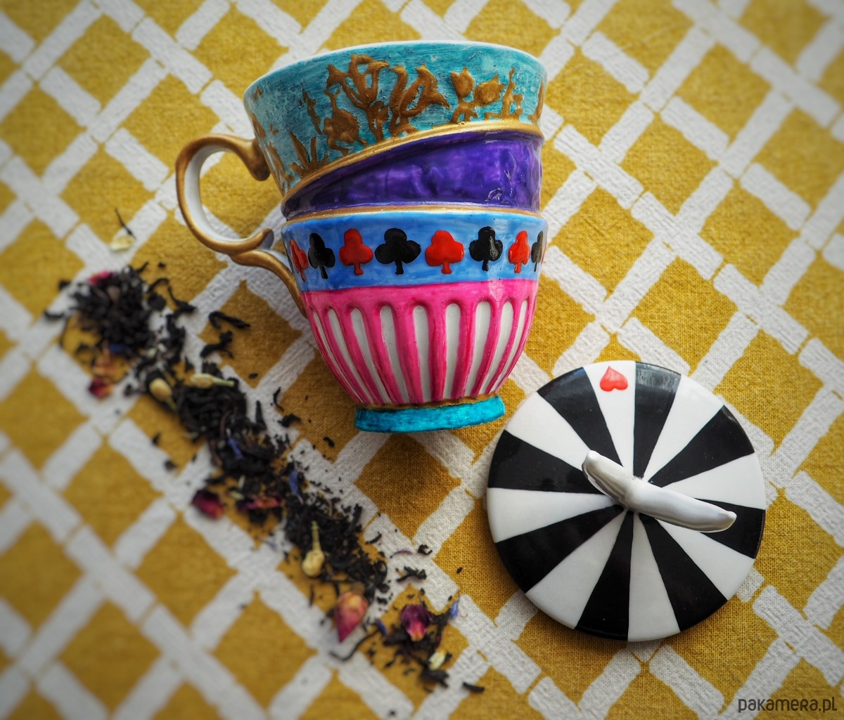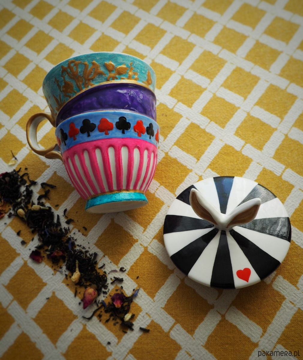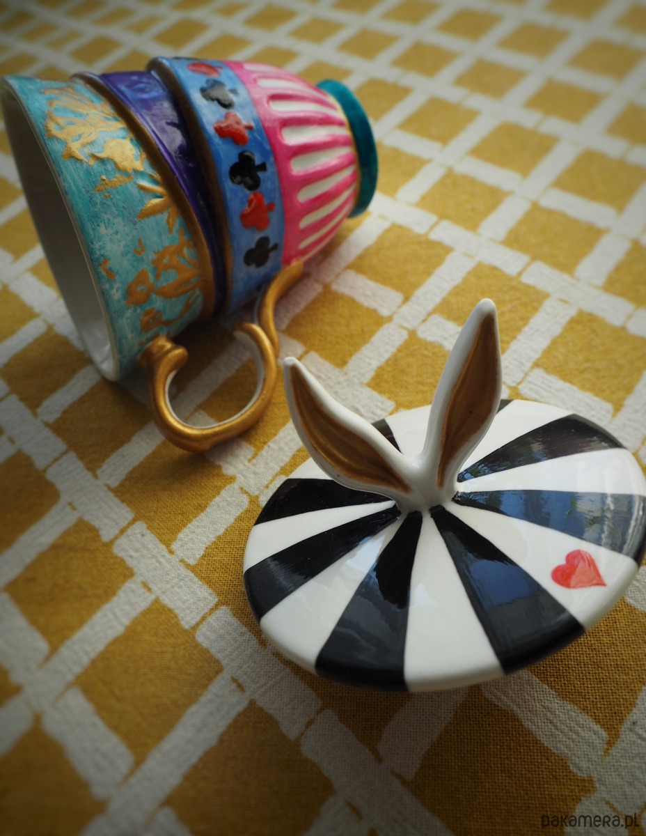 Idealny na podwieczorek z Szalonym Kapelusznikiem, Szarakiem bez Piątej Klepki i Alicją, ręcznie malowany zestaw to wspaniały upominek dla wielbicieli przygód w Krainie Czarów. Żywe kolory, malunek w stylu retro i fantastyczna pokrywka z króliczymi uszami przyciągną wzrok i umilą popołudniową herbatkę. Imitujący stos starych filiżanek kubek możesz przykryć, by dłużej zachować temperaturę napoju, lub by zaparzyć w nim ulubione zioła.