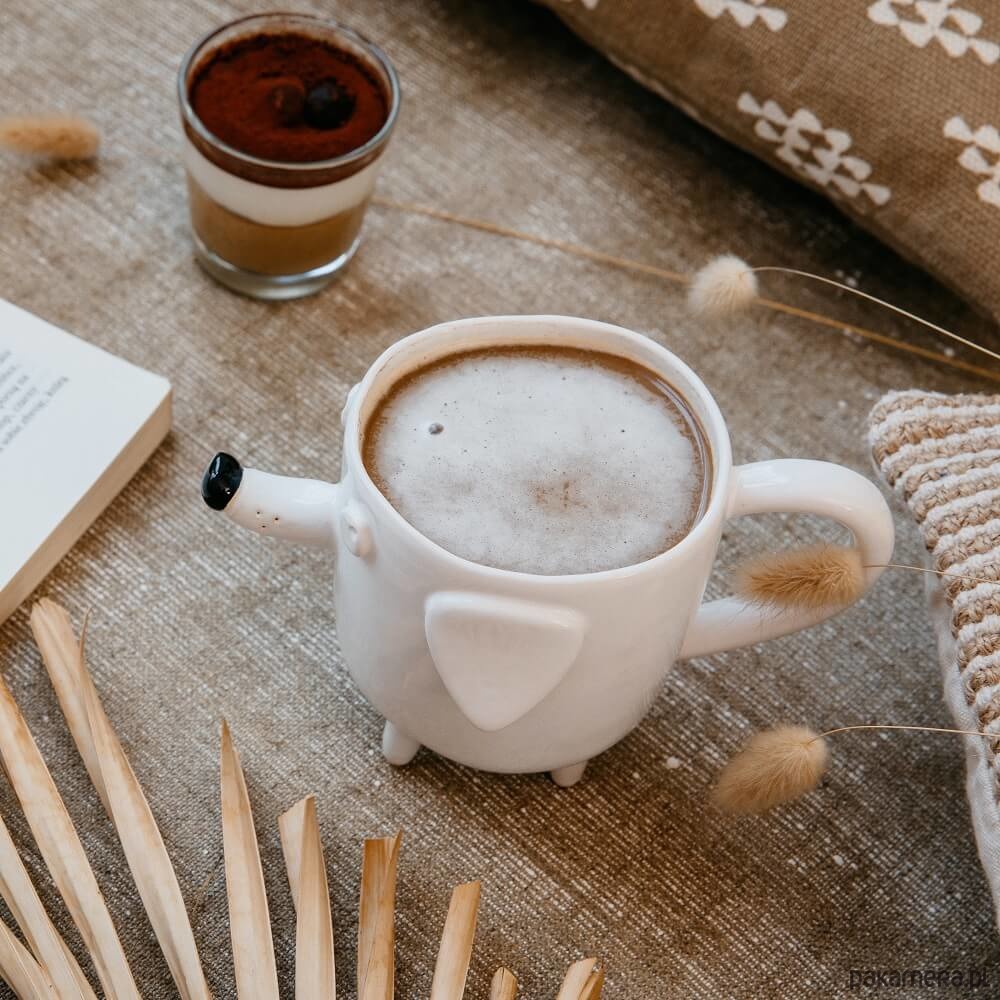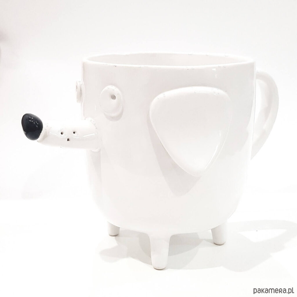 Duży ceramiczny kubek Azorek w kolorze białym. Azorek na każdym etapie został wykonany ręcznie bez użycia koła garncarskiego, przez co posiada nieco nieregularną formę i może delikatnie różnić od tego widocznego na zdjęciu. Każdy piesek jest niepowtarzalny w swoich detalach. Sygnowany na spodzie.