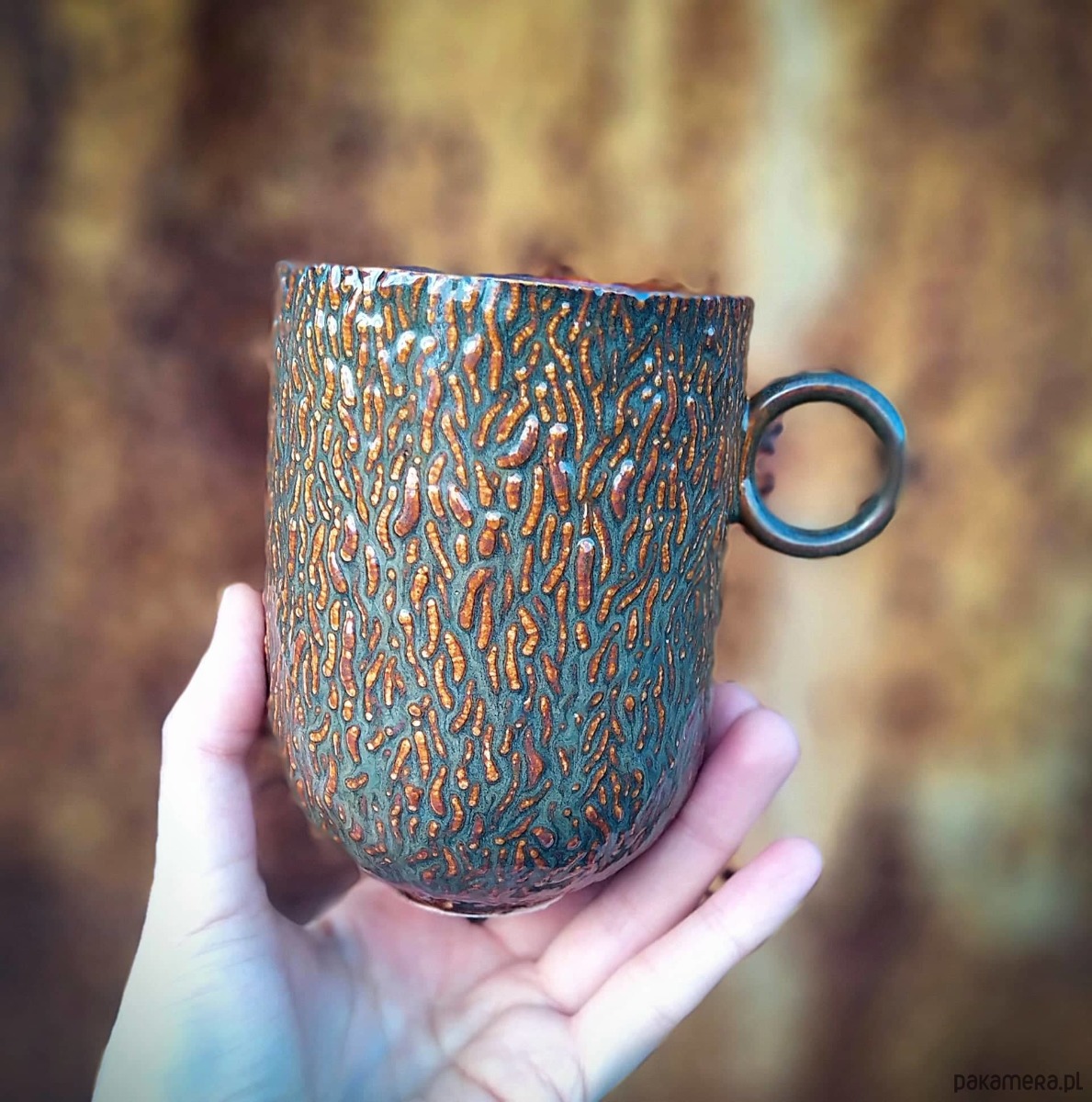 Ceramiczny kubek ręcznie wykonany z mocno spieczonej barwionej kamionki, inspirowany mikrostrukturami form organicznych, szkliwiony szarobrązowym szkliwem. Wymiary: wysokość ok.11,5cm, średnica ok.8,5cm