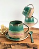 Ręcznie robiony kubek ceramiczny ze spodeczkiem i ozdobną łyżeczką z kolekcji Rajska Plaża.