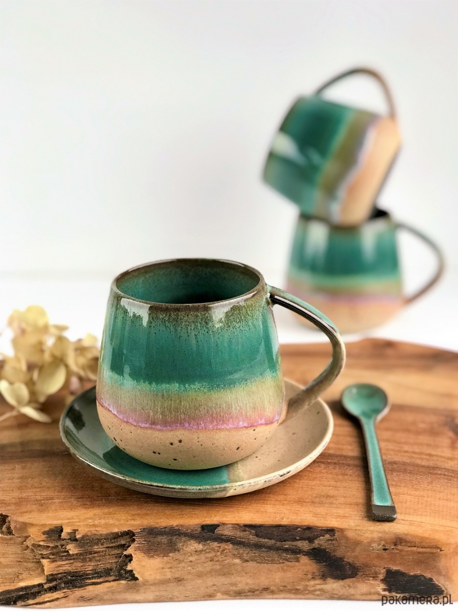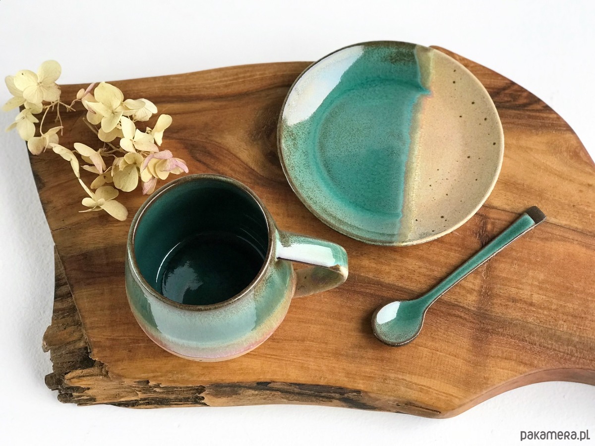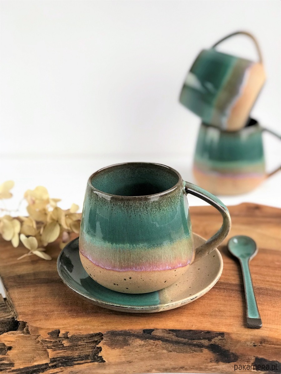 Ręcznie robiony kubek ceramiczny ze spodeczkiem z kolekcji Rajska Plaża.