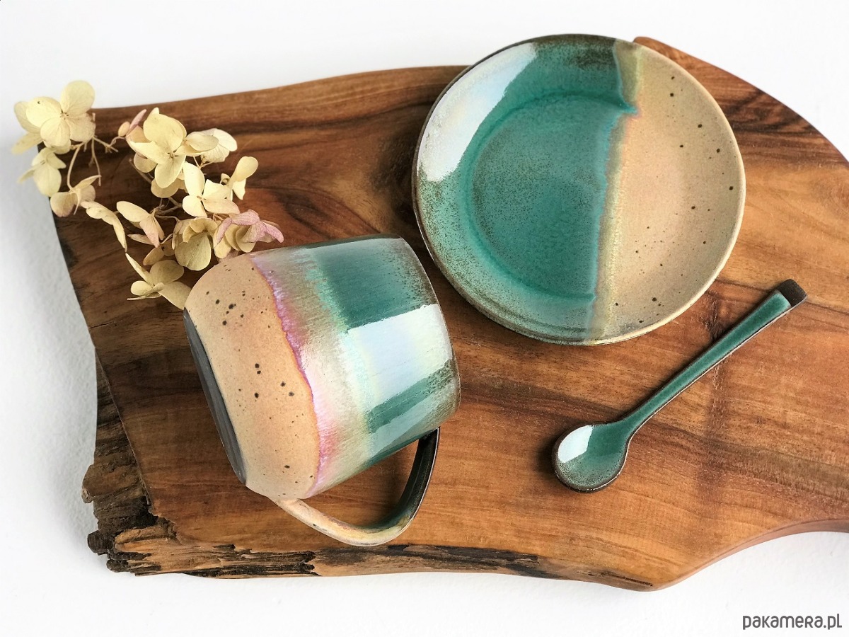 Ręcznie robiony kubek ceramiczny ze spodeczkiem z kolekcji Rajska Plaża.
