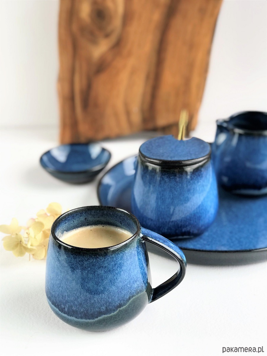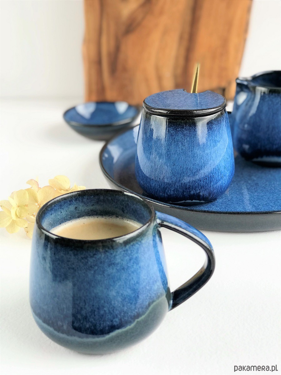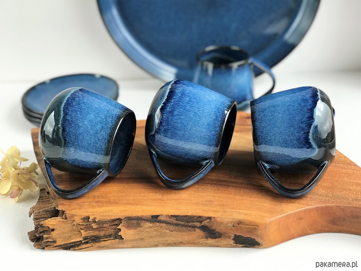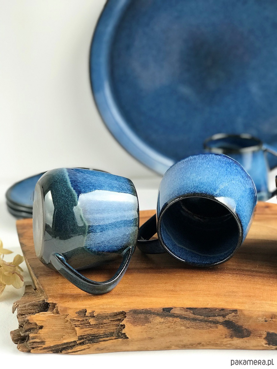 kolory: niebieski, granat, czerń na ciemnoczekoladowej masie ceramicznej