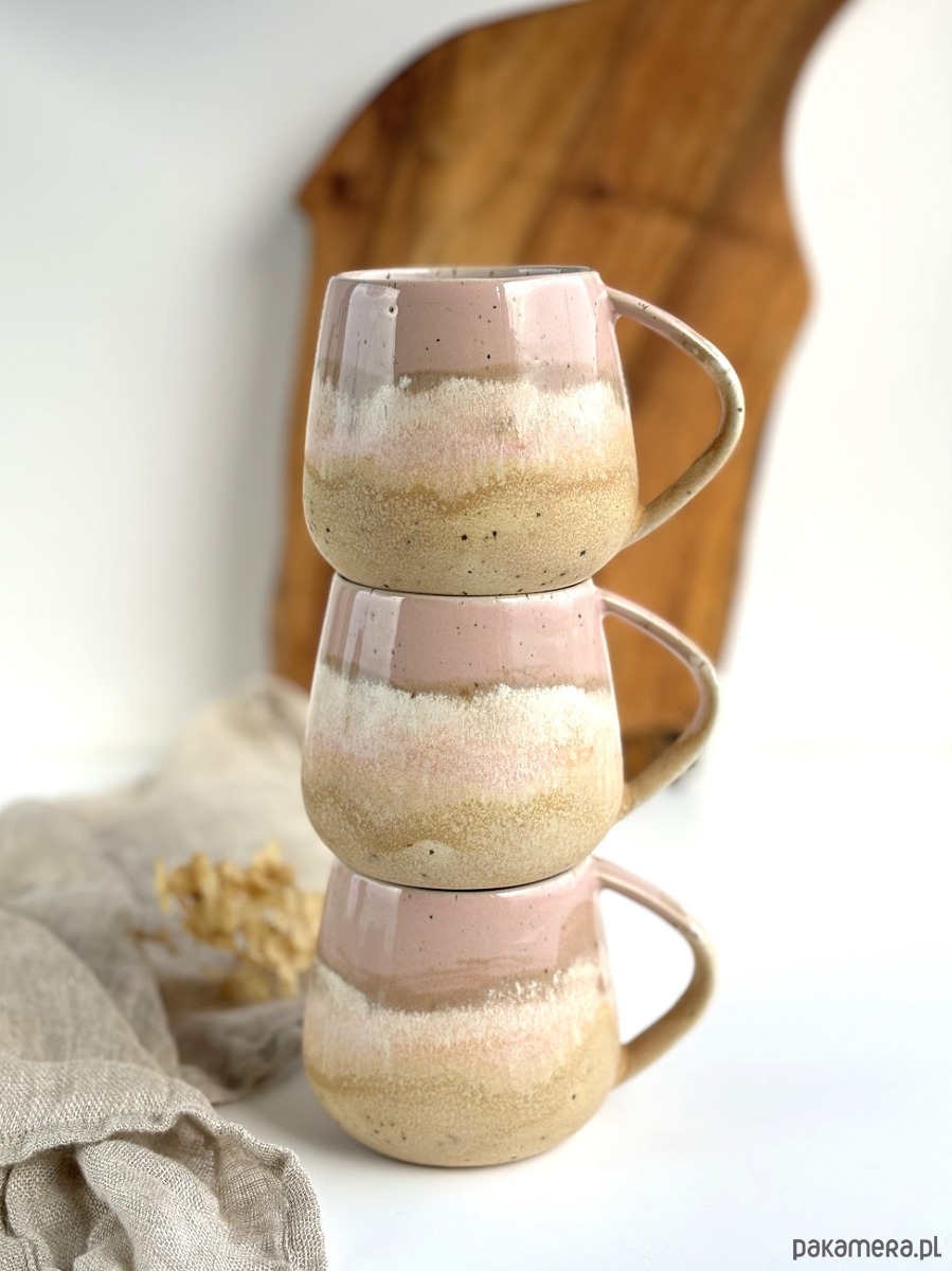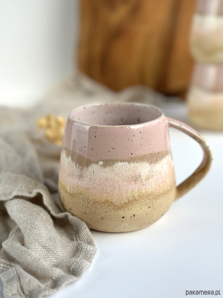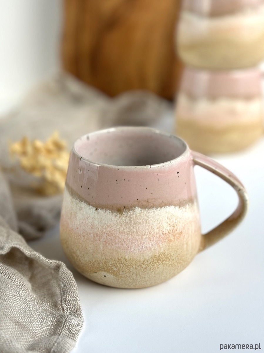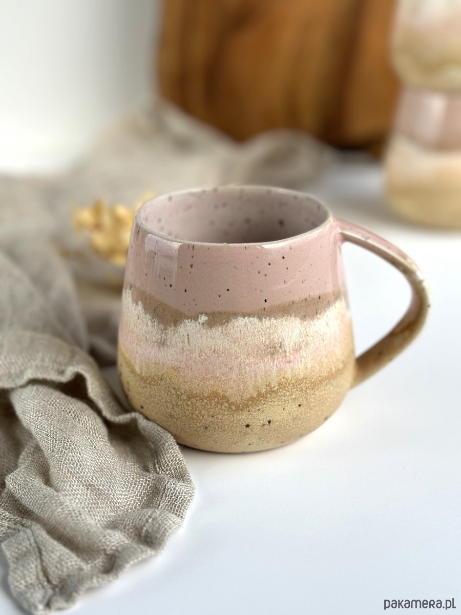 kolory: odcienie delikatnego różu, piasku oraz bieli wewnątrz kubka na beżowej masie ceramicznej w centki