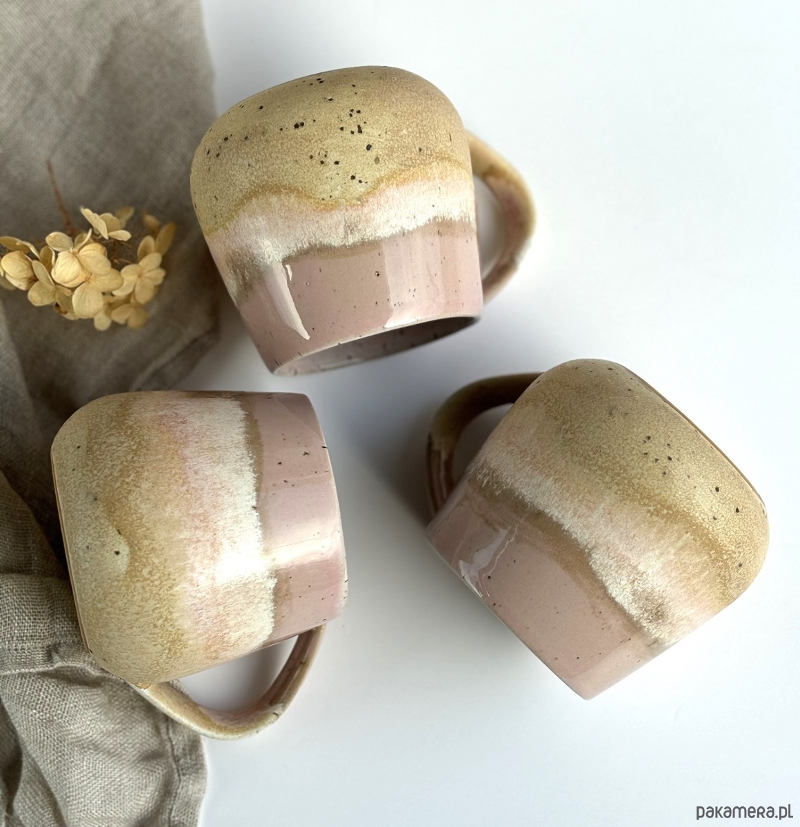 Pięknie się przenikające odcienie delikatnego różu oraz odcieni piasku na beżowej masie ceramicznej z centkami.