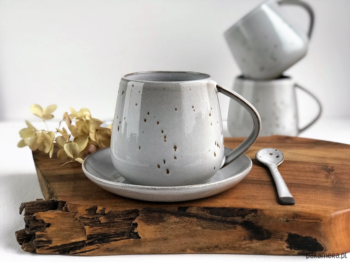 Kubki wykonane metodą ręcznego odlewania a spodeczki wykonane ręcznie z plastra gliny.