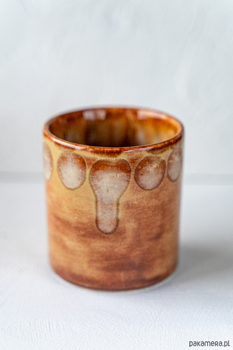 Kamionkowy kubek bez ucha wykonany z jasnej gliny, pokryty nakrapianym szkliwem.