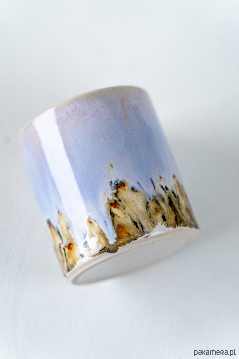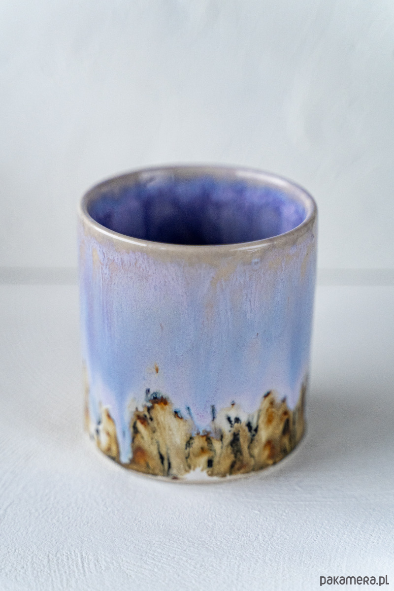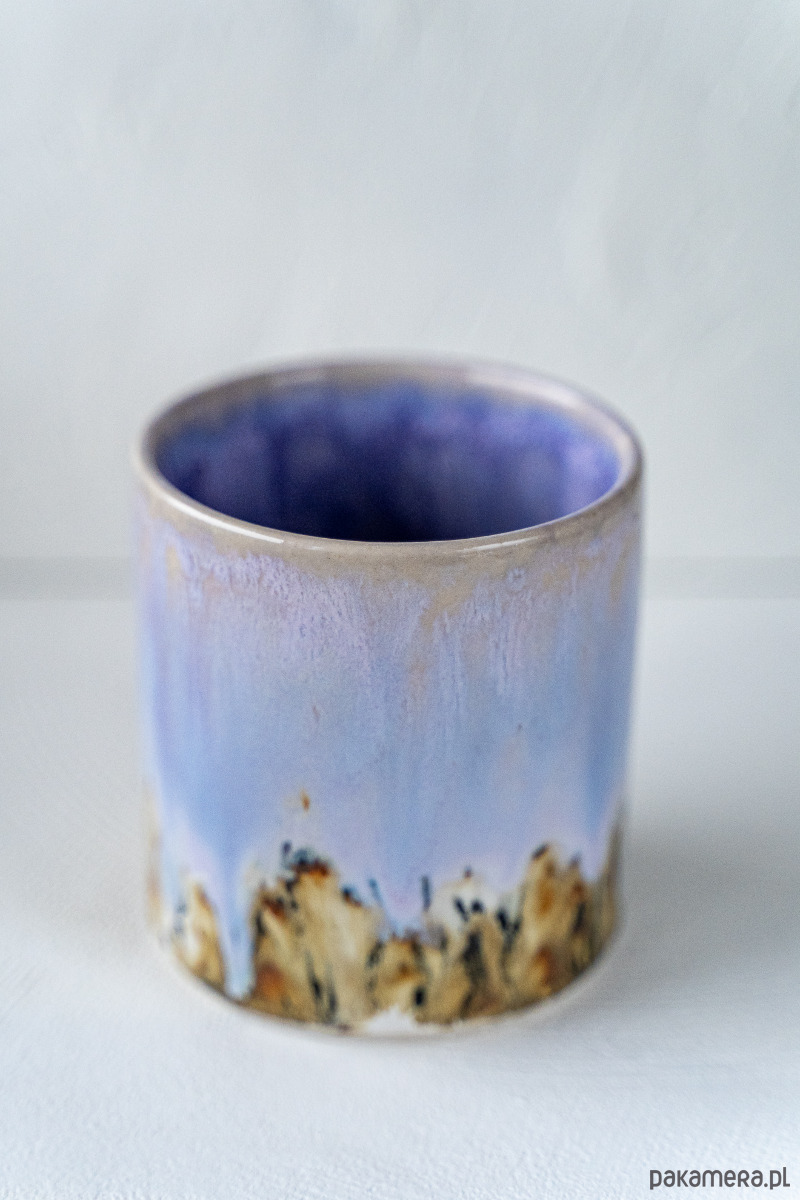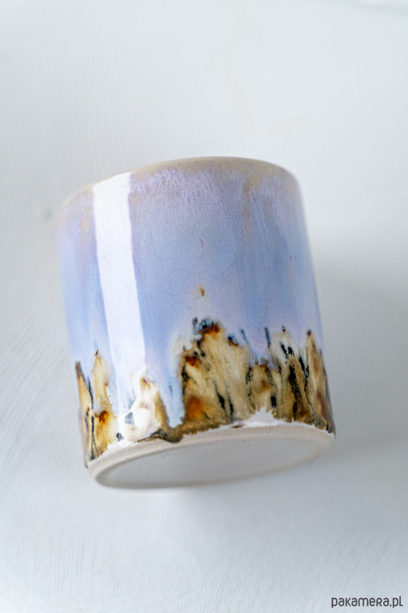 Kamionkowy kubek bez ucha wykonany z jasnej gliny, pokryty nakrapianym szkliwem.