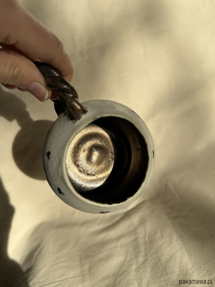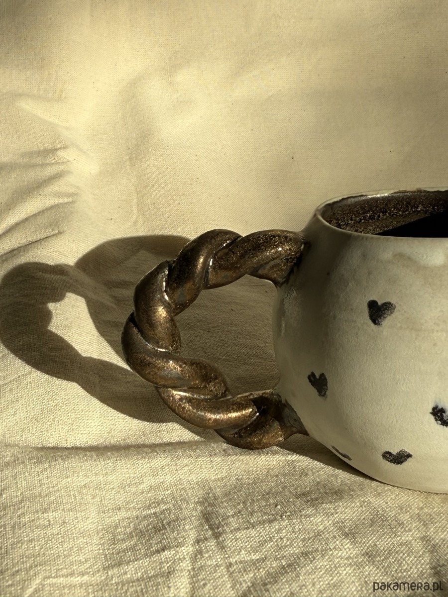 Uwagę przyciąga masywne, skręcane ucho wykończone złotym, metalicznym szkliwem. Ten kontrast między delikatną formą kubka a mocnym, rzeźbiarskim detalem nadaje całości wyrazisty charakter i sprawia, że kubek jest jednocześnie użytkowy i dekoracyjny.