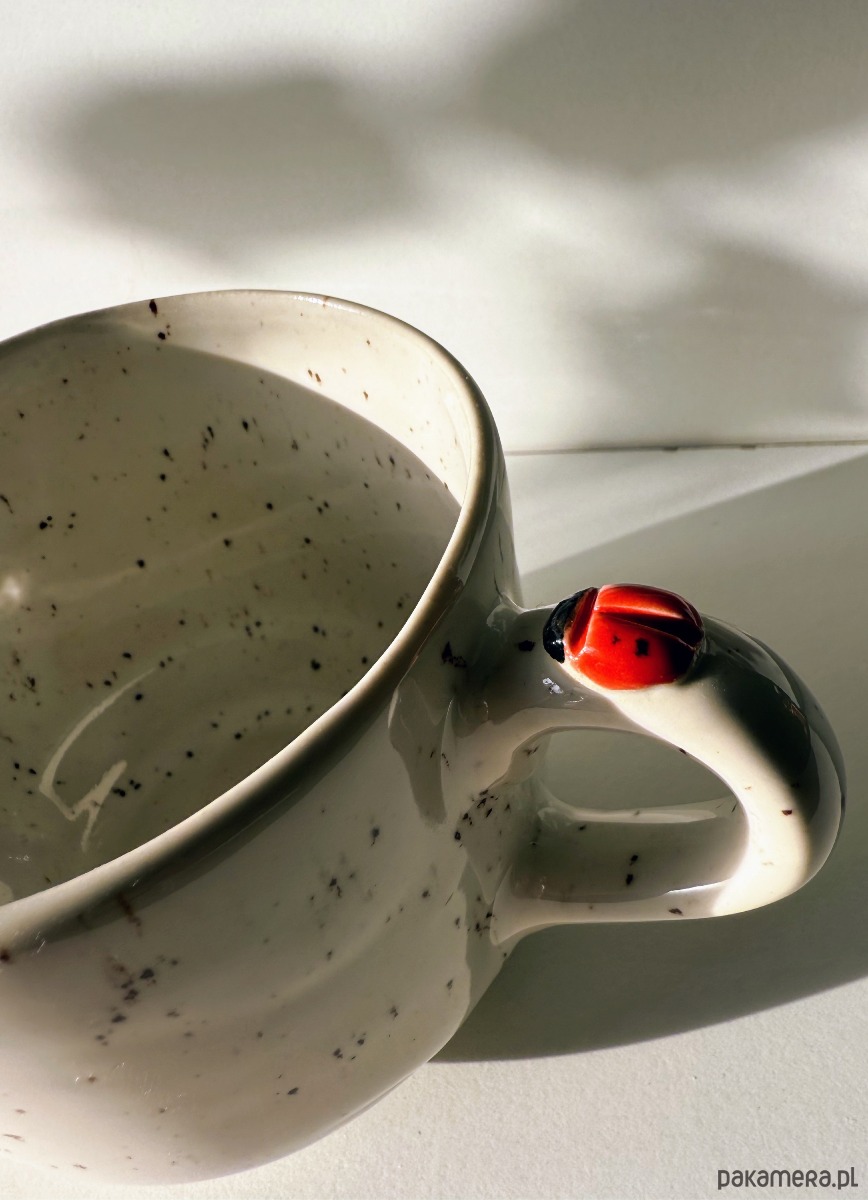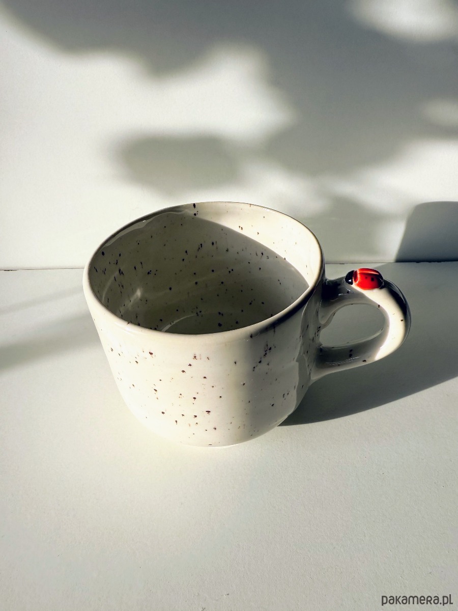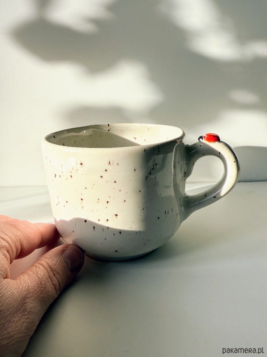 Minimalistyczny kubek ceramiczny, pokryty białym szkliwem w piegi z małą biedronką na uchwycie. Kubek został wykonany ręcznie w podpoznańskiej pracowni, każdy egzemplarz różni się od siebie.