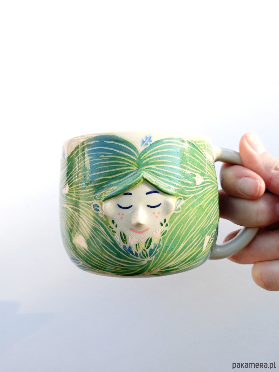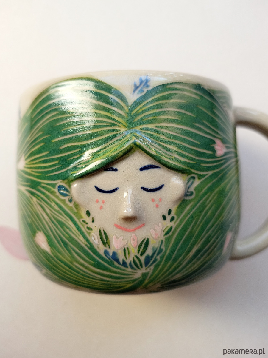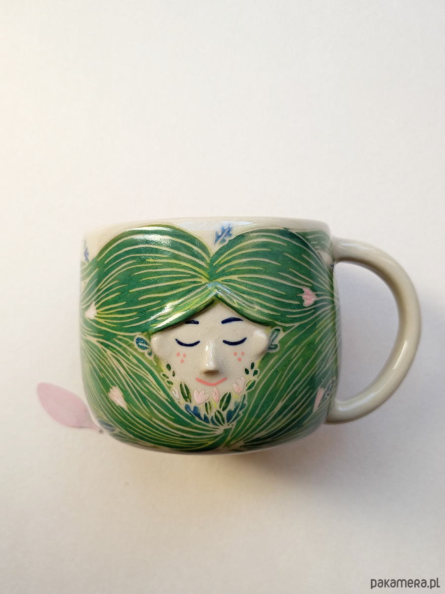 Kubek ozdobiony twarzą dziewczyny wśród falujących traw gdyż łąka jest kobietą . To doskonały kubek na przywołanie wiosny!