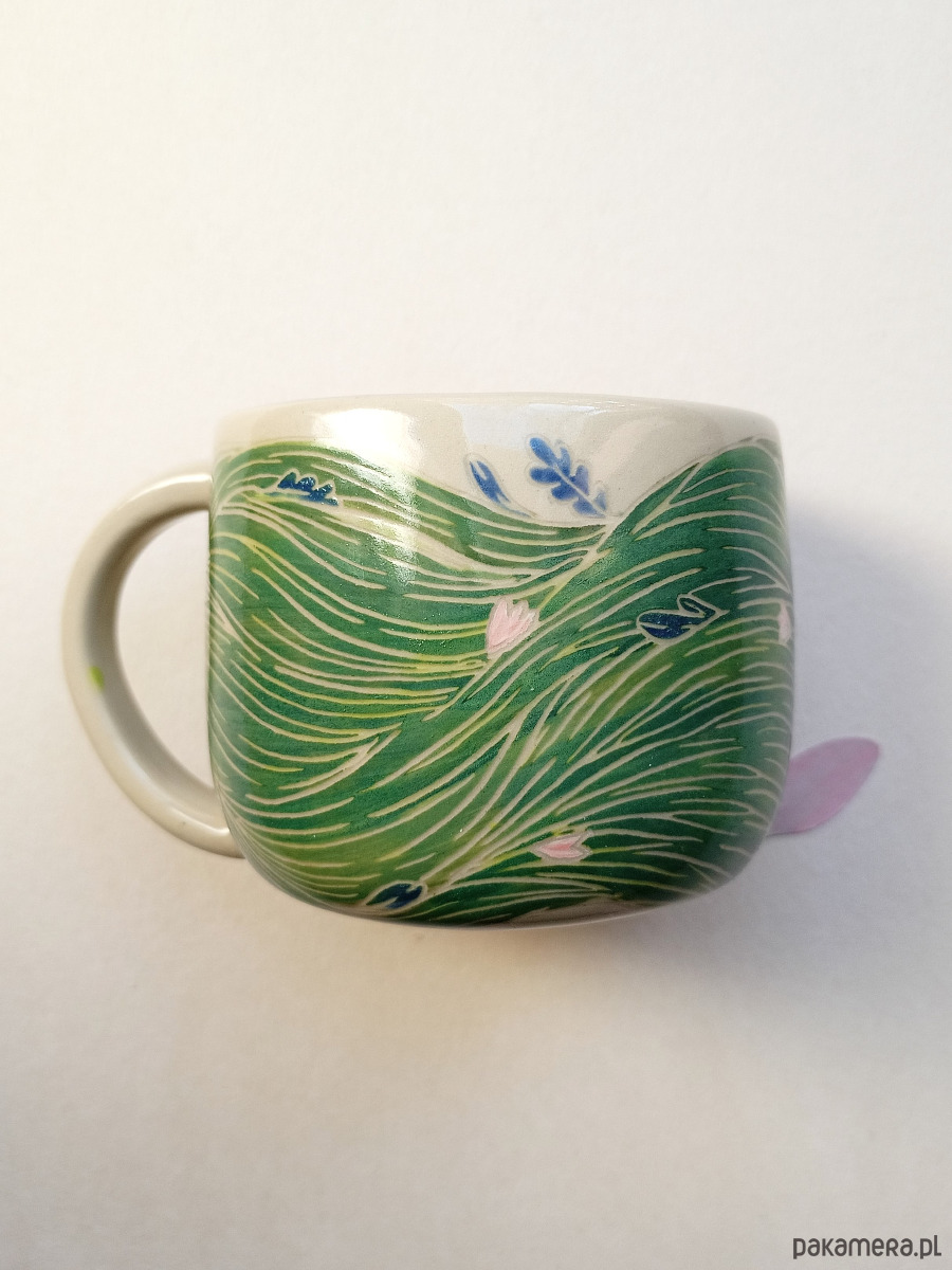 Autorski kubek z ceramiki wykonany i zdobiony ręcznie.