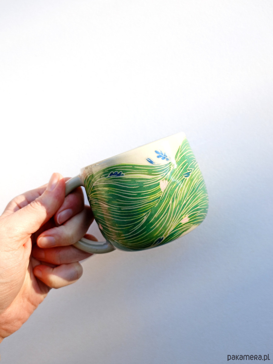 Kubek wykonany w technice sgraffito - wzór jest ręcznie wyryty na kubku, przez co jest niepowtarzalny!