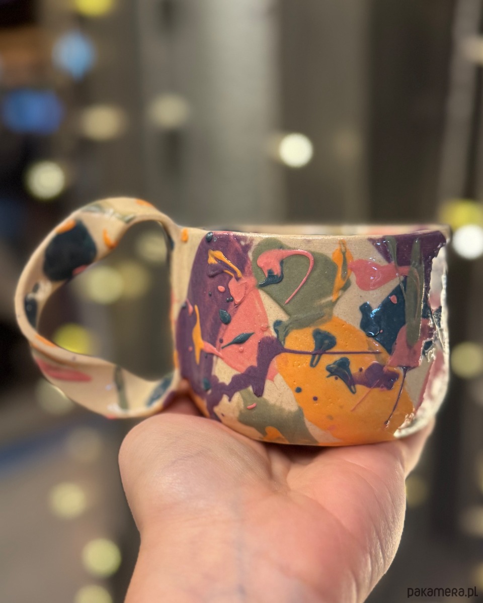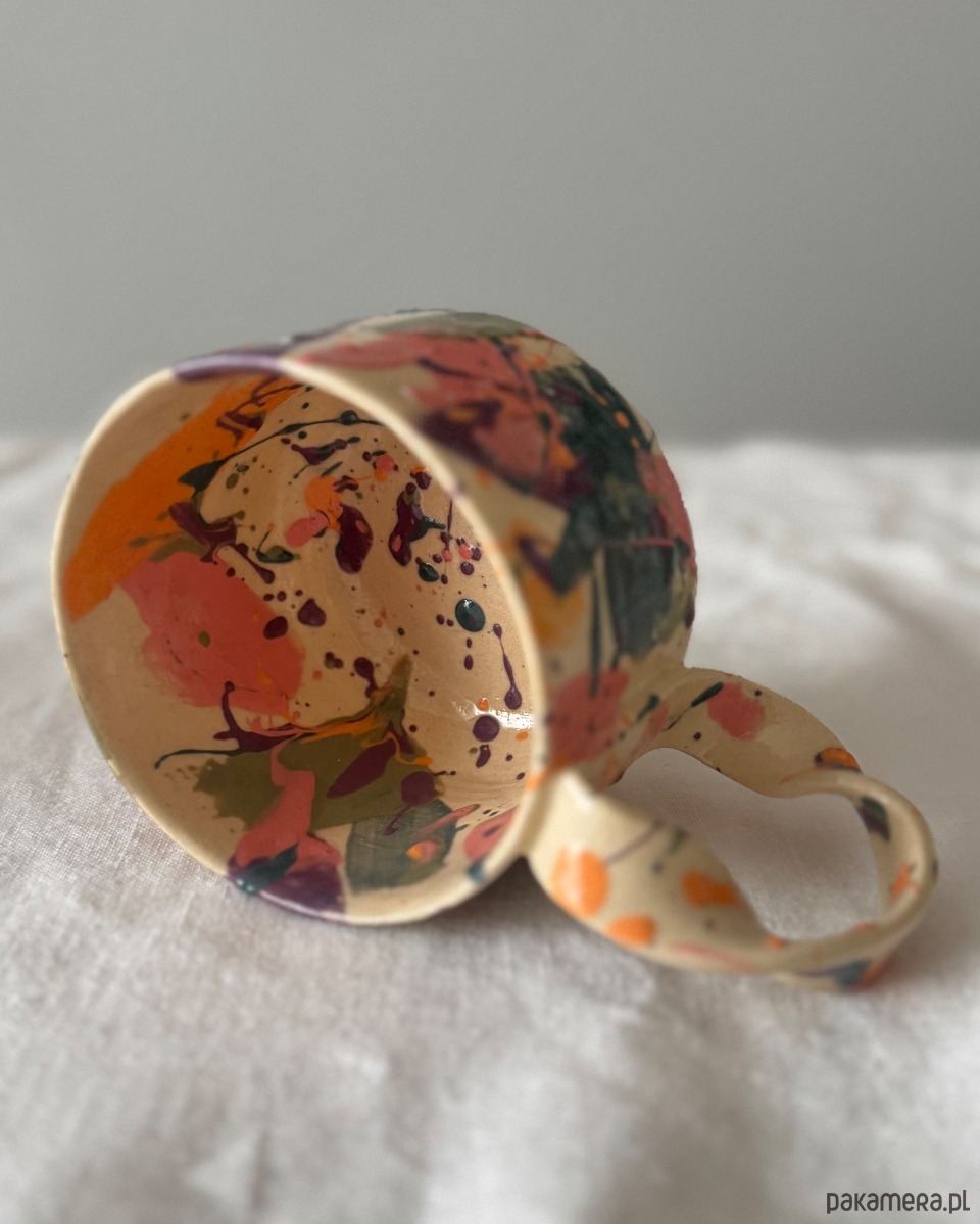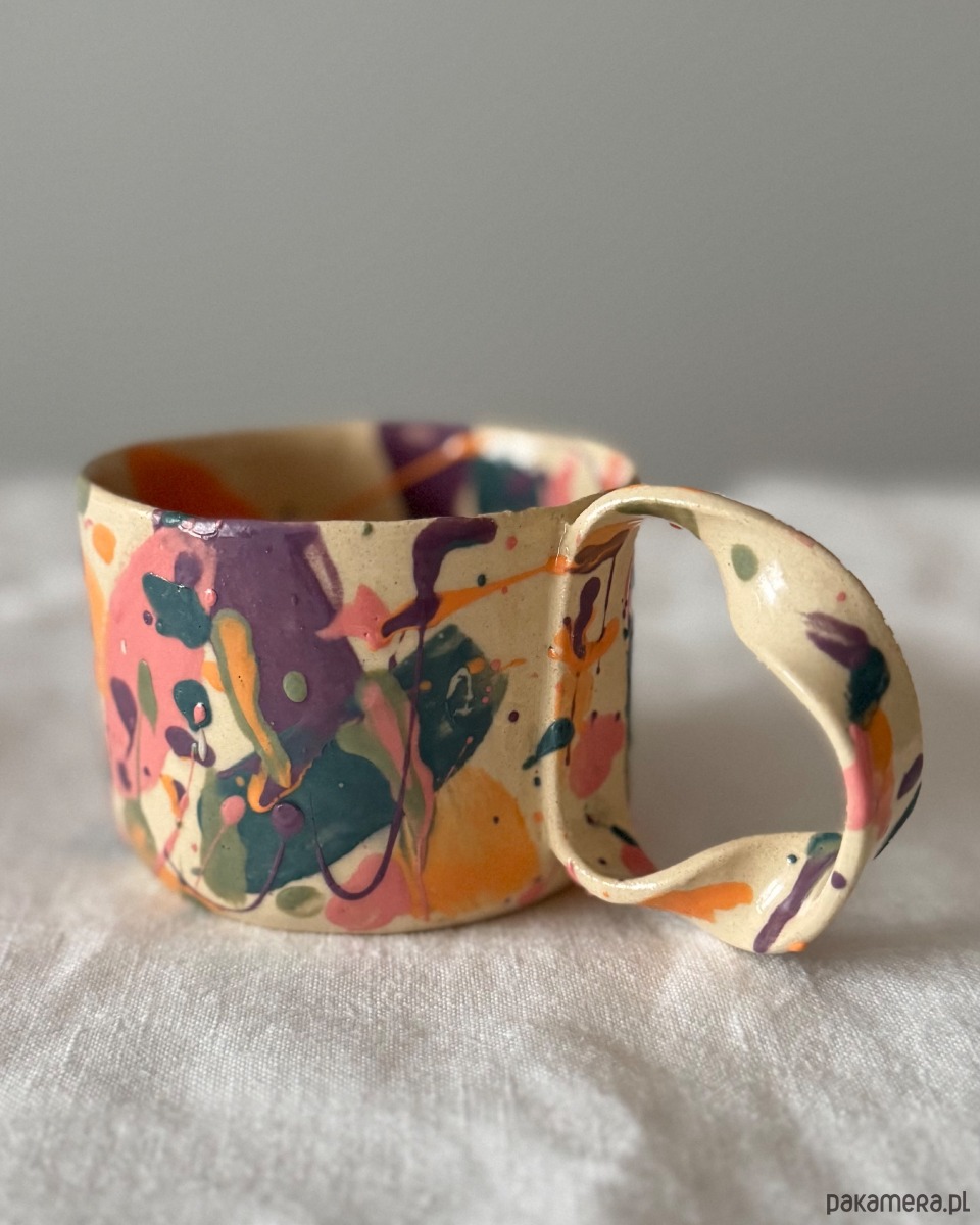 Wykonany ręcznie z ceramiki, zachwyca energetyczną paletą barw – dynamiczne chlapania fioletu, zieleni, pomarańczu i różu tworzą niepowtarzalny, abstrakcyjny wzór. Każdy egzemplarz jest unikatowy i różni się detalami.