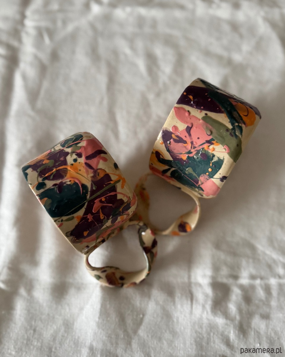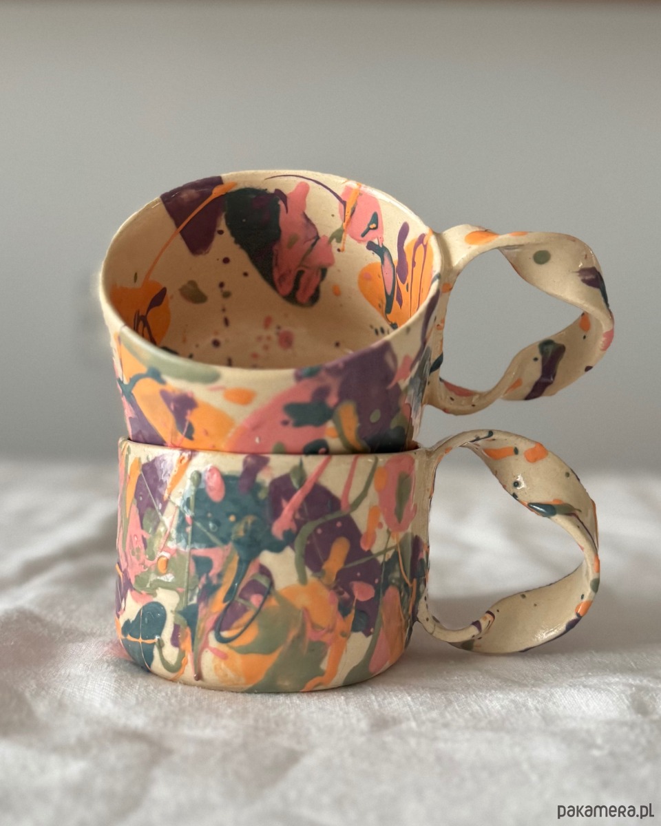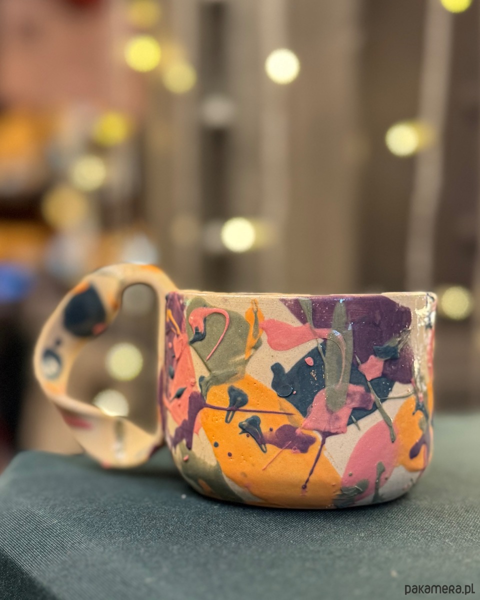 Wykonany ręcznie z ceramiki, zachwyca energetyczną paletą barw – dynamiczne chlapania fioletu, zieleni, pomarańczu i różu tworzą niepowtarzalny, abstrakcyjny wzór. Każdy egzemplarz jest unikatowy i różni się detalami.