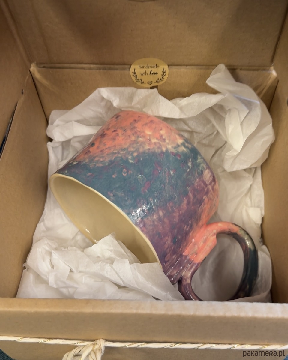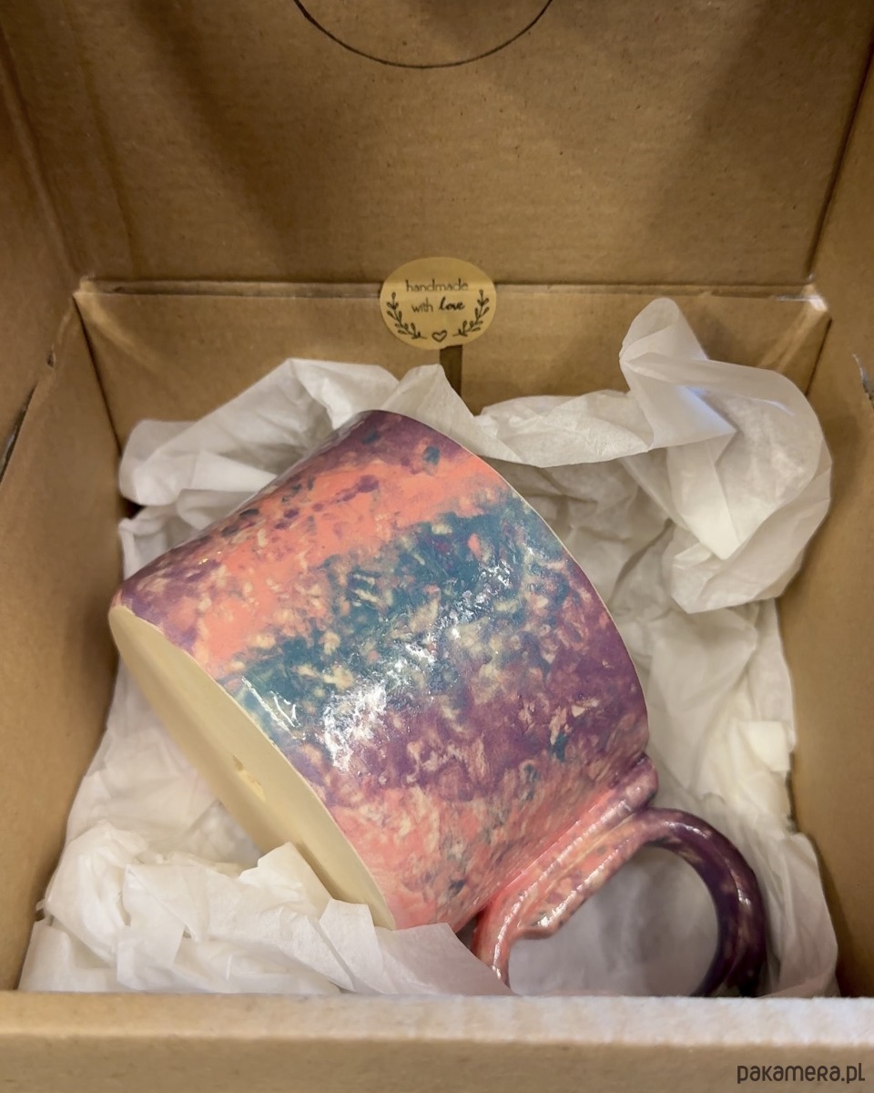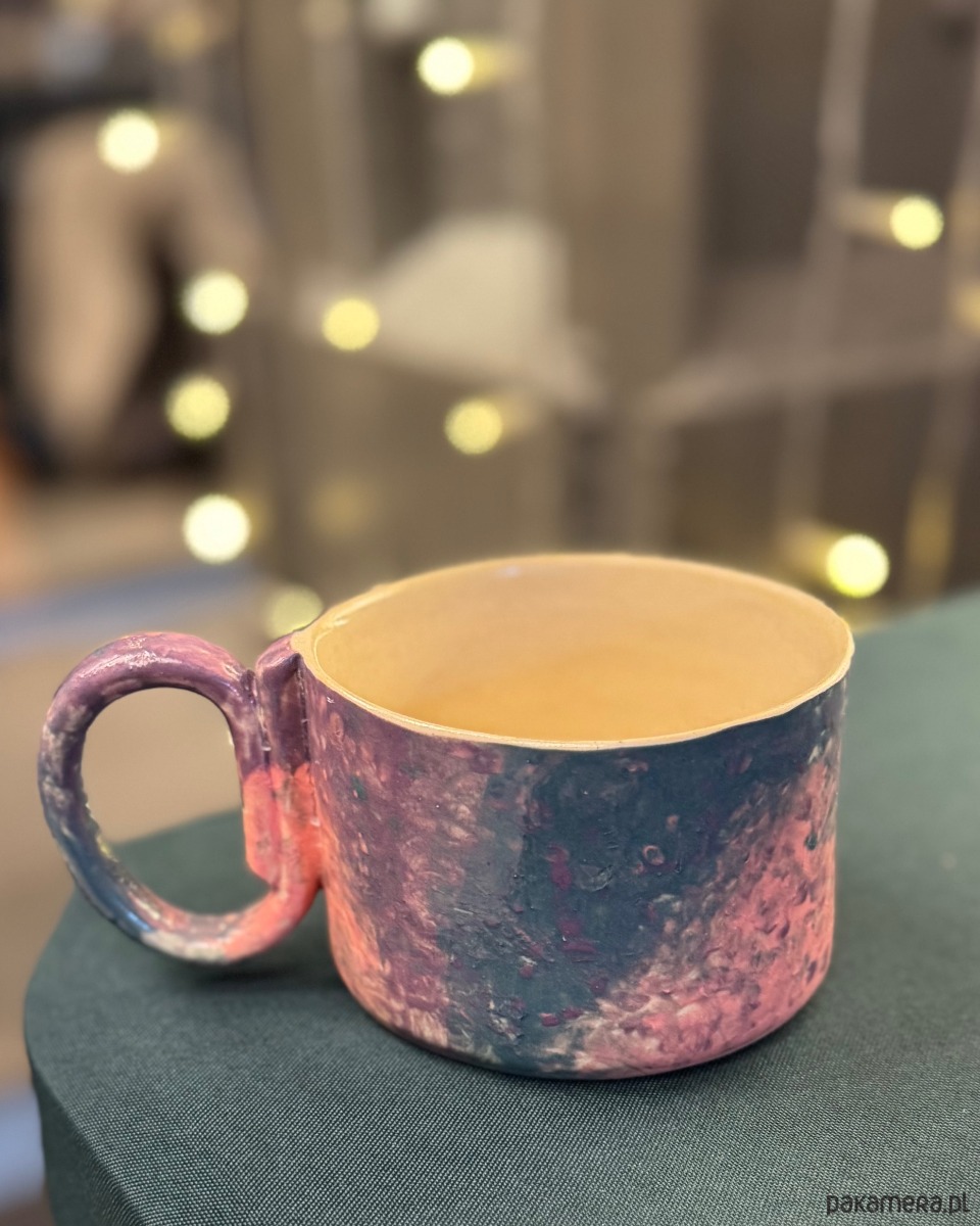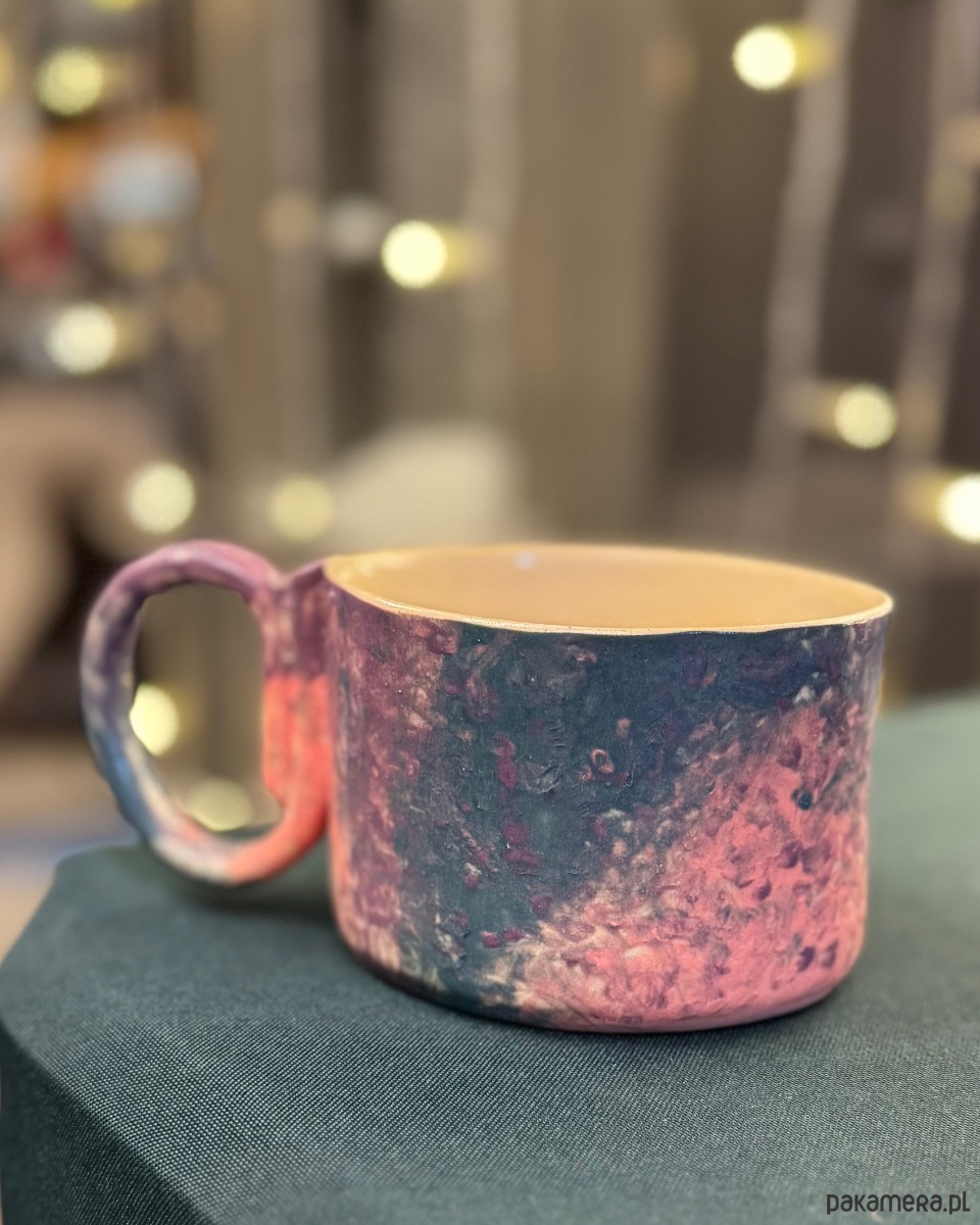 Wykonany ręcznie z ceramiki, zachwyca energetyczną paletą kolorów. Jego powierzchnia zdobiona jest pastelową mieszanką różu, fioletu i delikatnych odcieni niebieskiego, tworząc efekt przypominający akwarelowy pejzaż nieba. Każdy fragment kubka układa się w niepowtarzalny wzór – nie ma dwóch identycznych egzemplarzy.