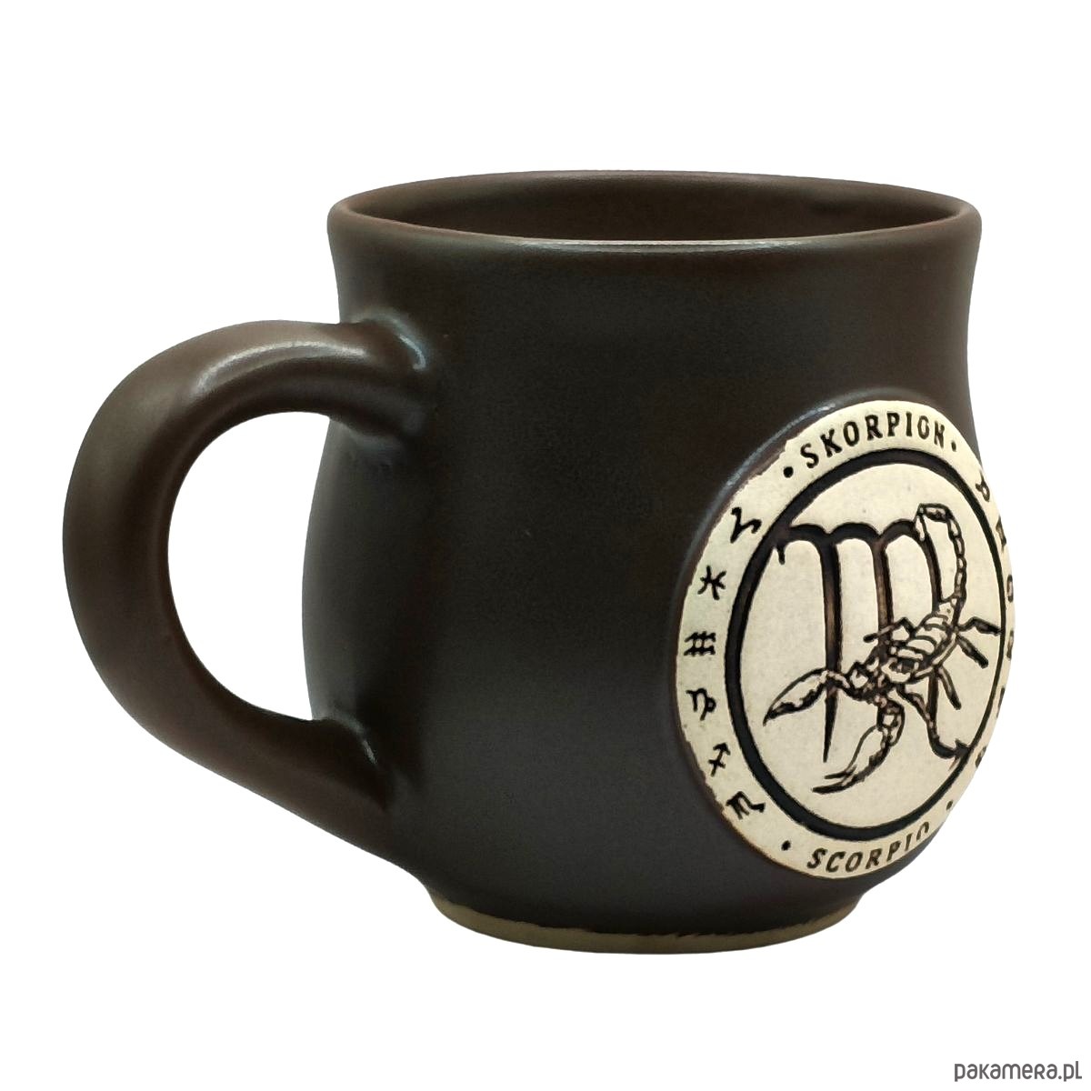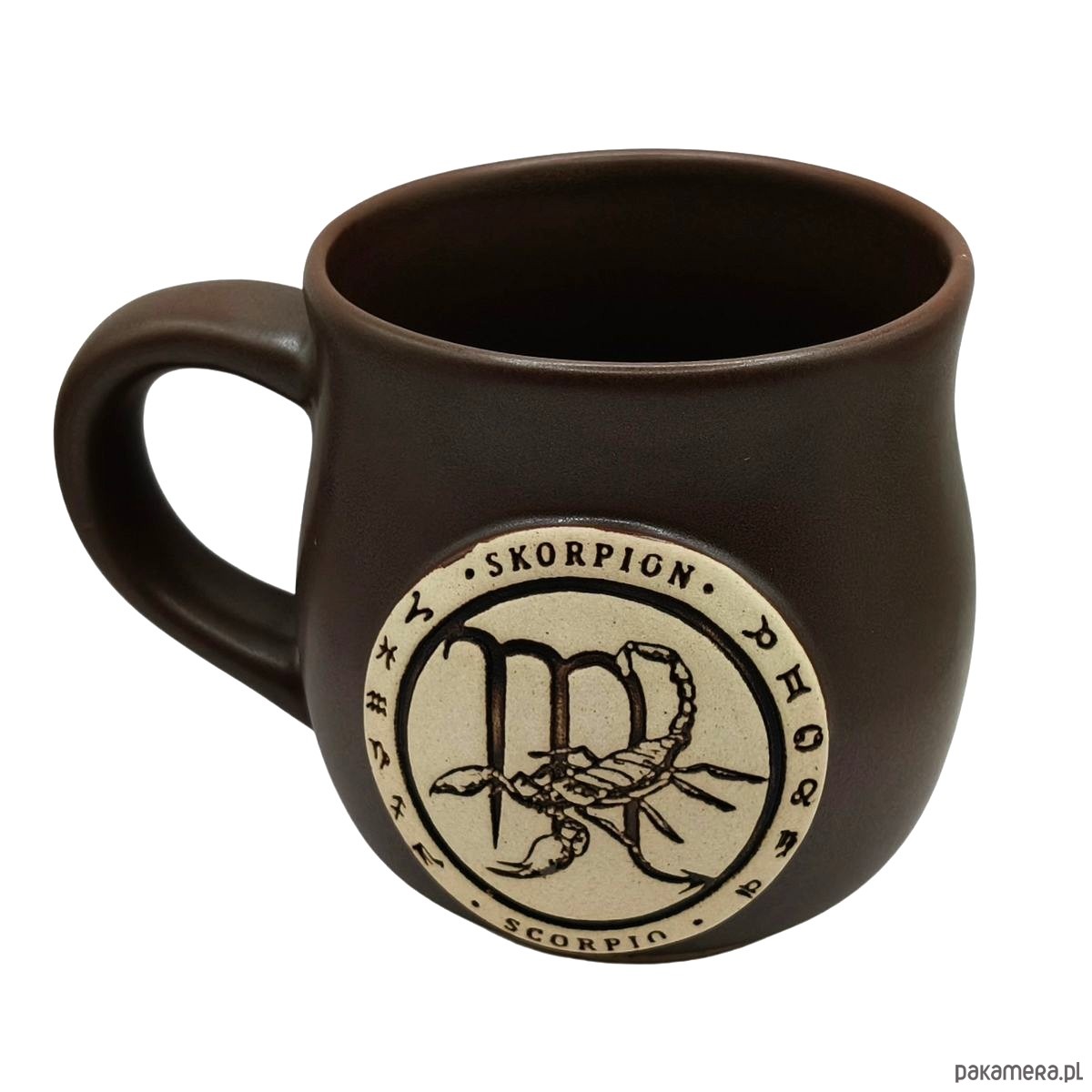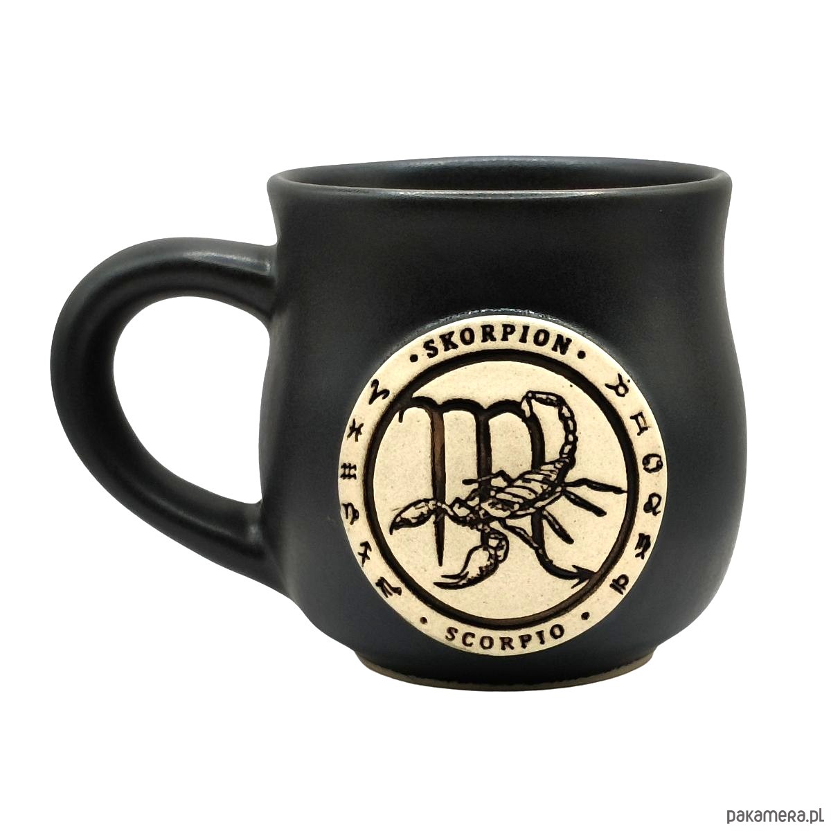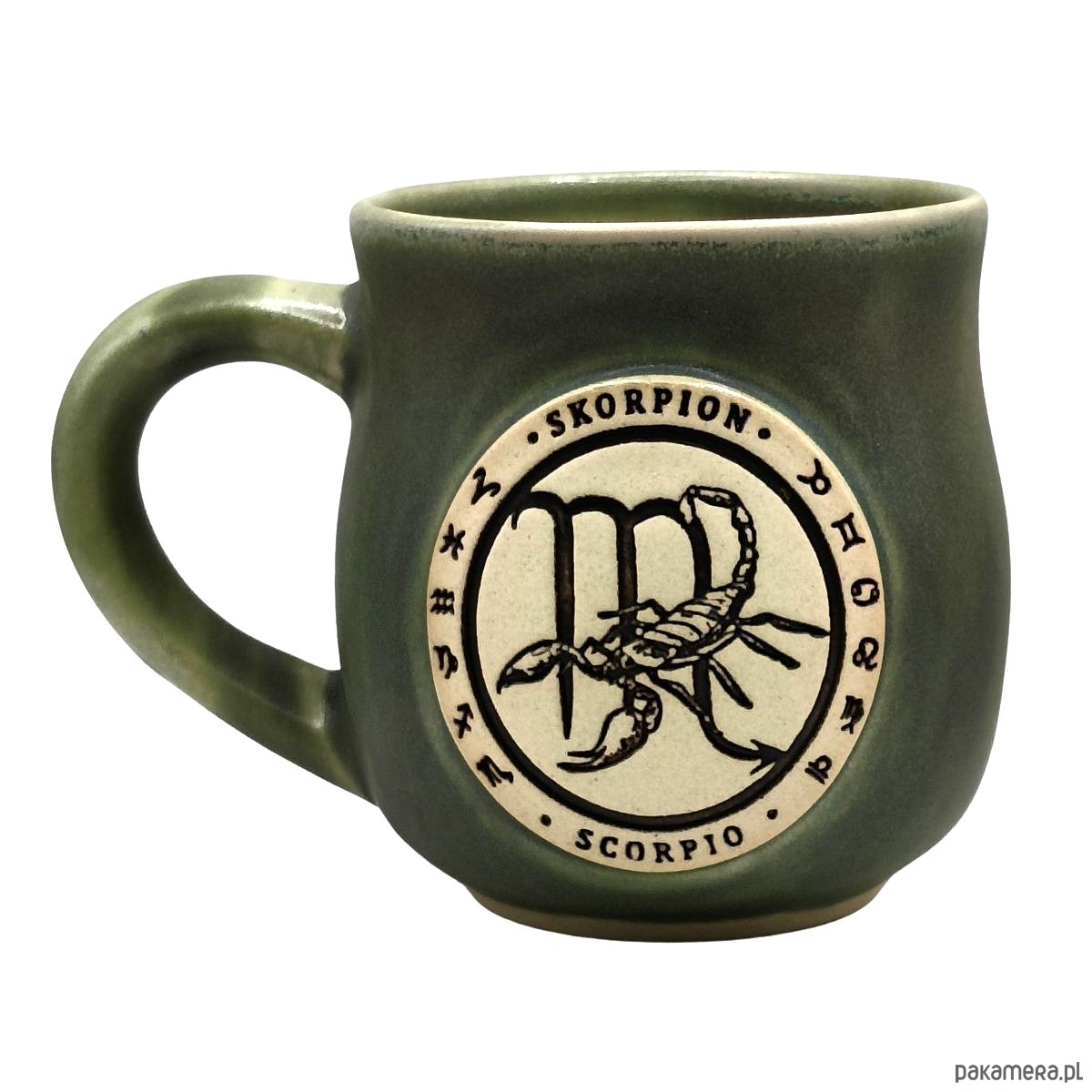 Unikalną ozdobą naczynia jest reliefowa etykieta przedstawiająca znak zodiaku Skorpion. Etykieta powstaje oddzielnie, a następnie jest aplikowana na surowy kubek jeszcze przed wypałem. Dzięki temu ozdoba trwale łączy się z powierzchnią i zachowuje pełnię szczegółów oraz elegancki wygląd przez długie lata.