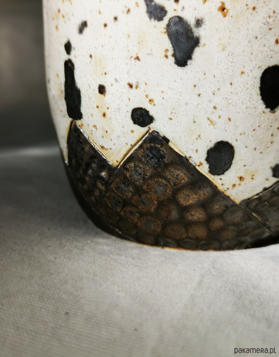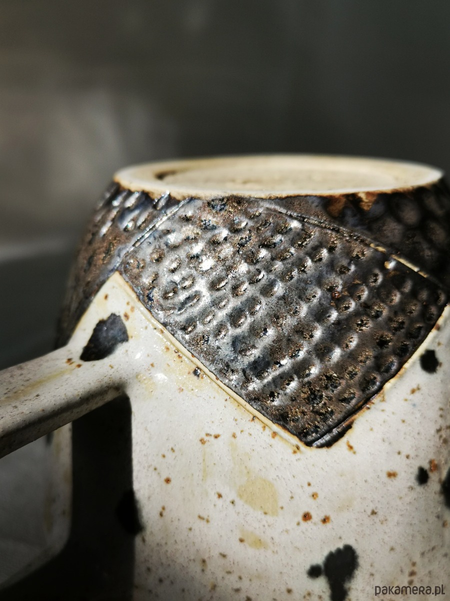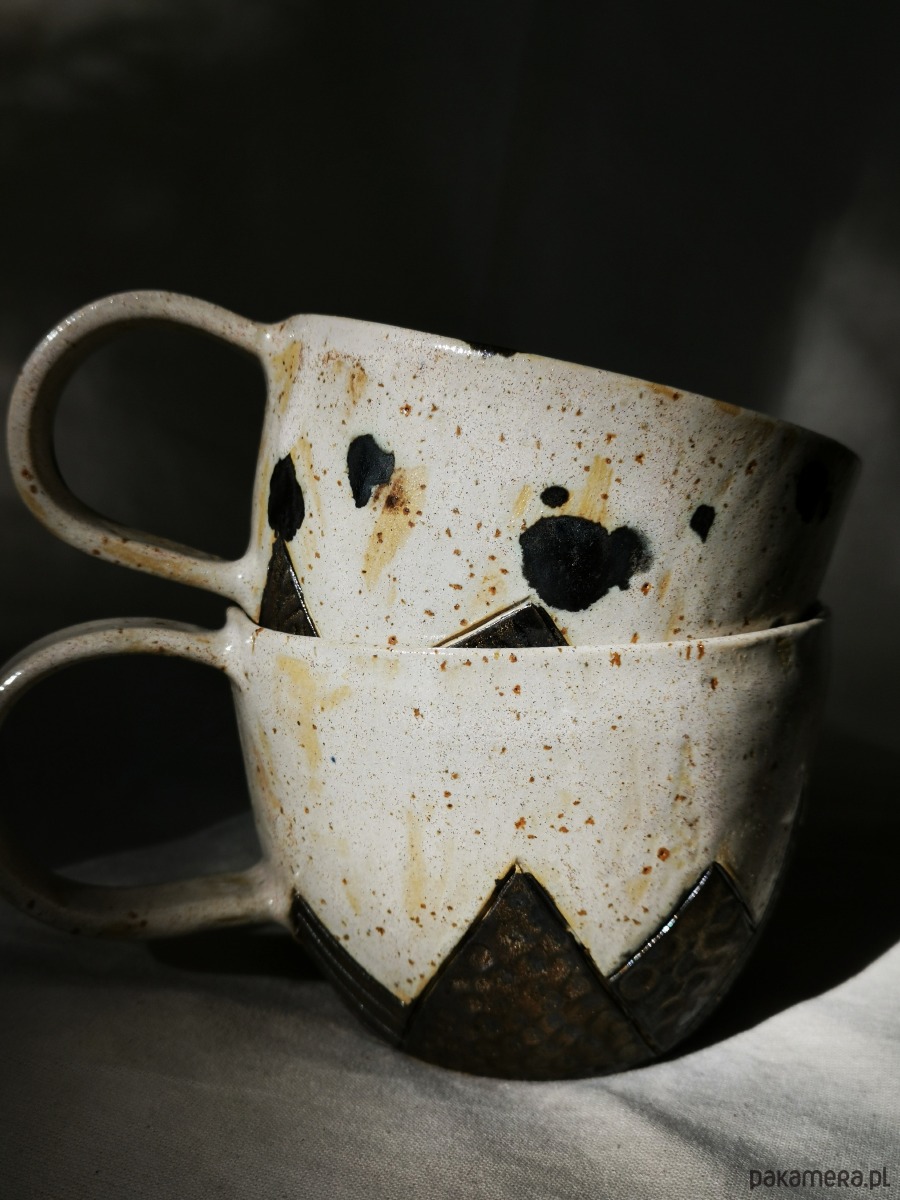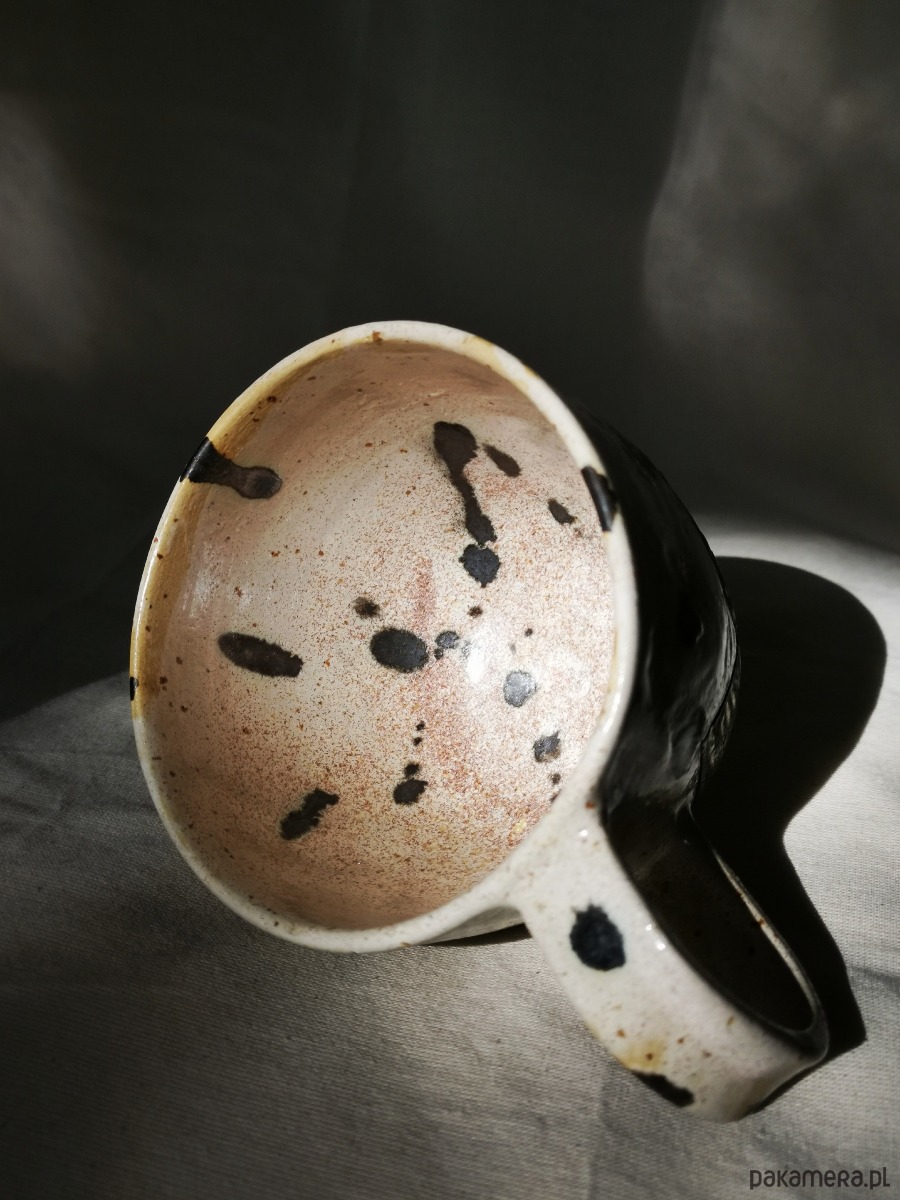 Jasna, kremowa glazura z subtelnymi nakropieniami kontrastuje z ciemniejszym, surowym dołem, inspirowanym skałą i ziemią. To kubek dla osób, które lubią naturę, prostotę i przedmioty z charakterem.