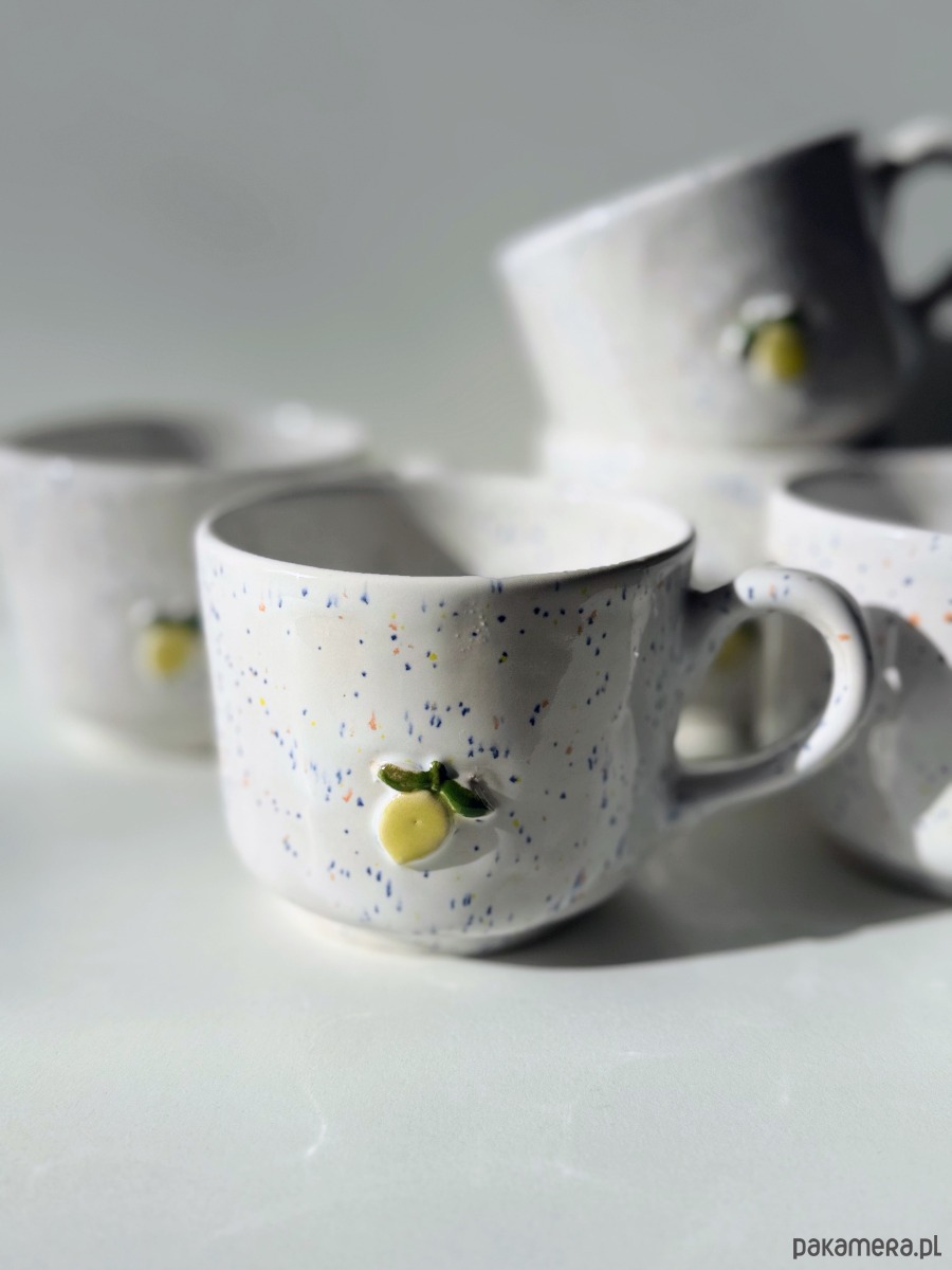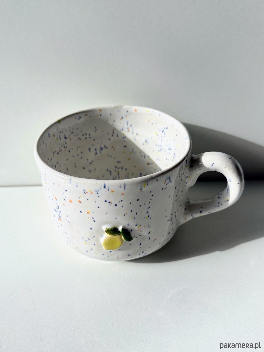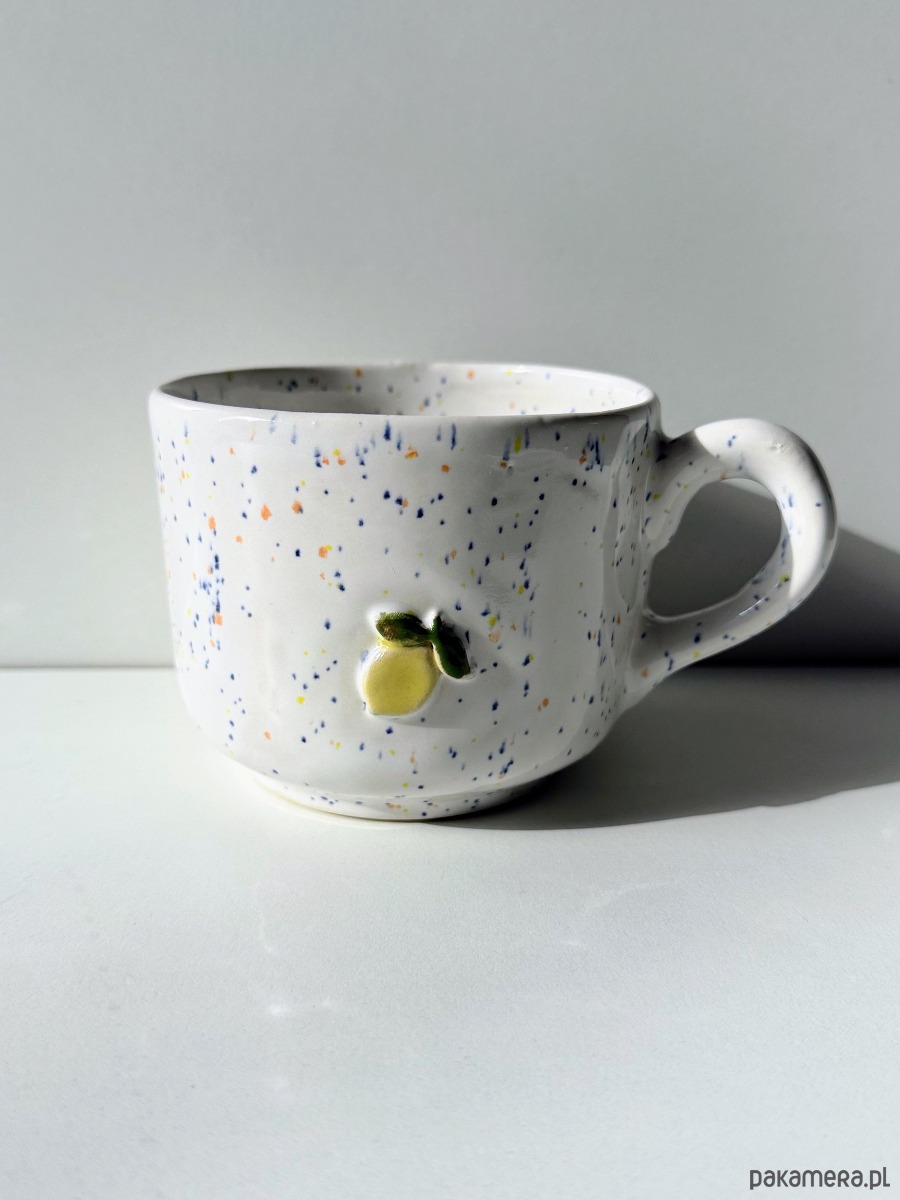 Kubek ceramiczny ręcznie wykonany w podpoznańskiej pracowni. Pokryty białym szkliwem z kolorowymi piegami. Żółta cytrynka z zielonym listkiem znajduje się po obydwu stronach kubka - dla prawo i leworęcznych.