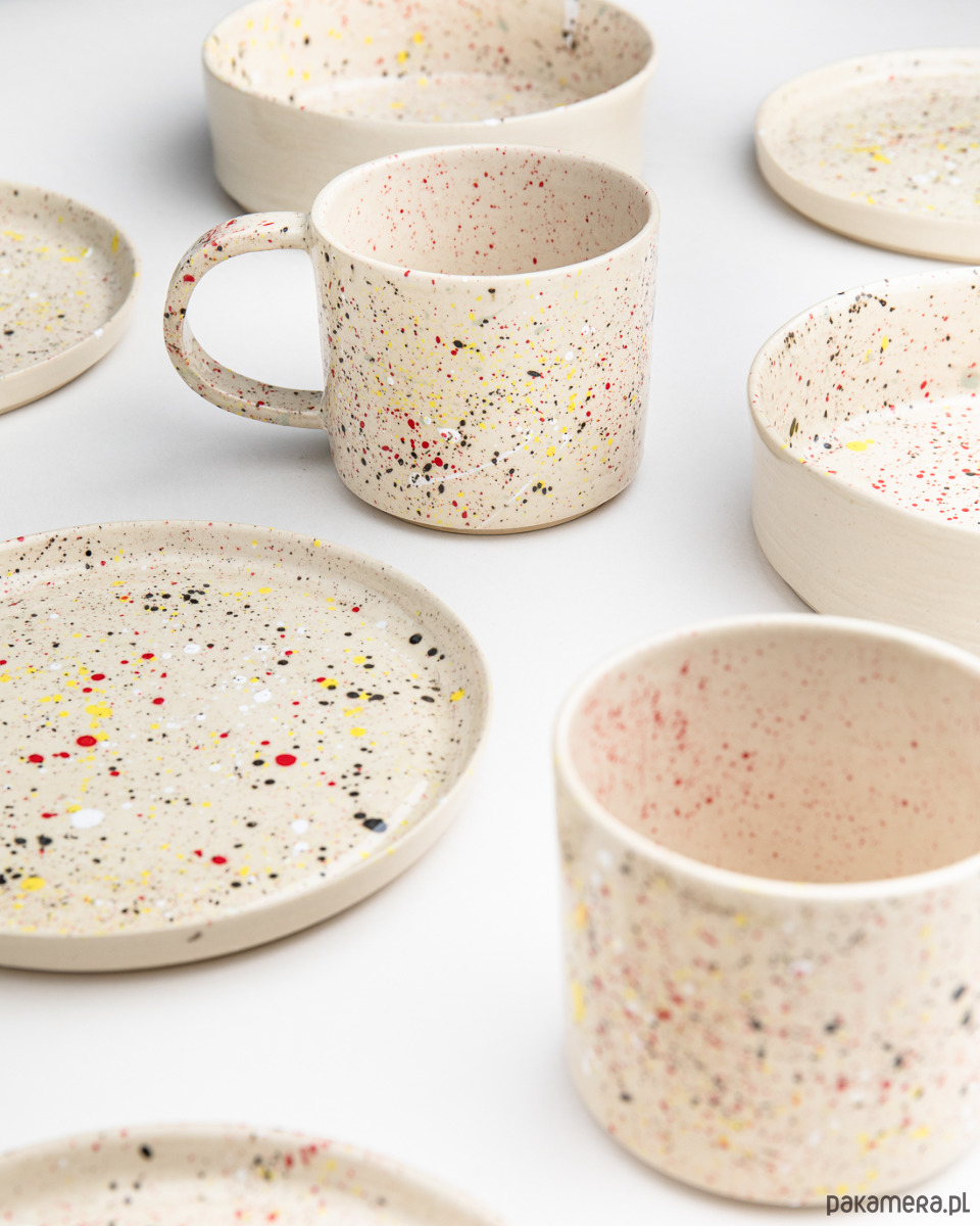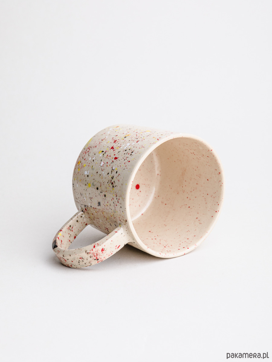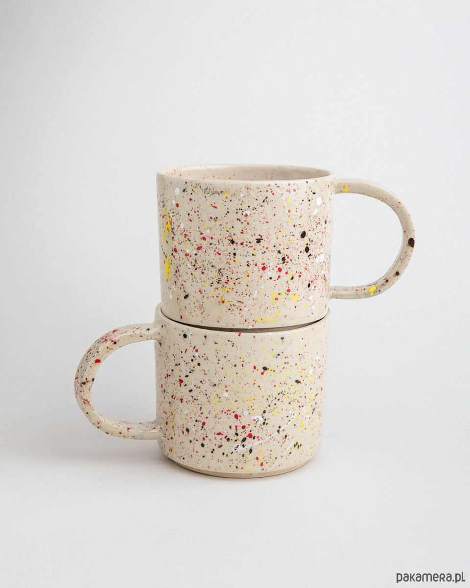 Kubki wykonane ręcznie z kremowej gliny, pochlapane farbą podszkliwną i pokryte szkliwem spożywczym przeznaczonym do kontaktu z żywnością.