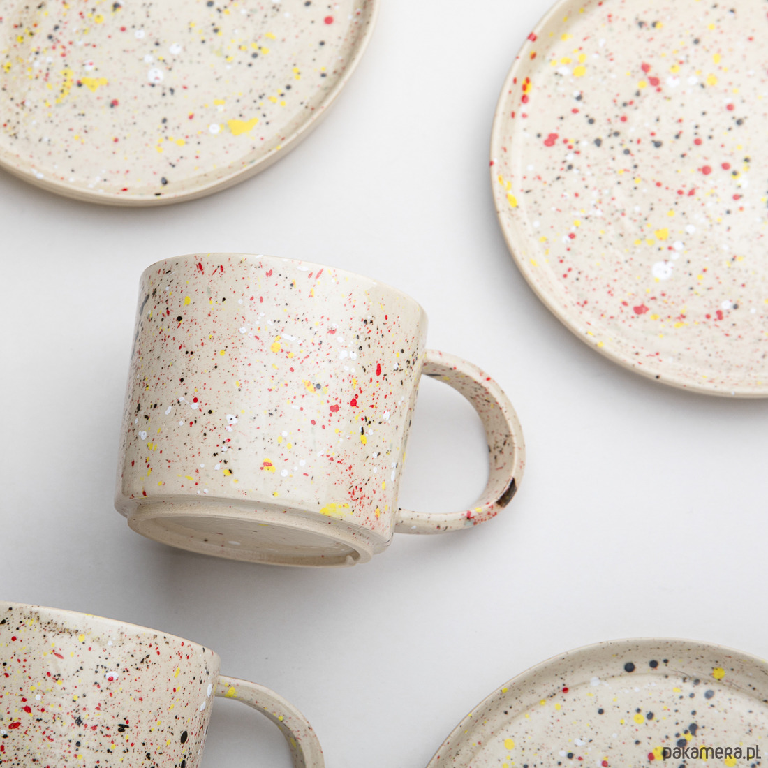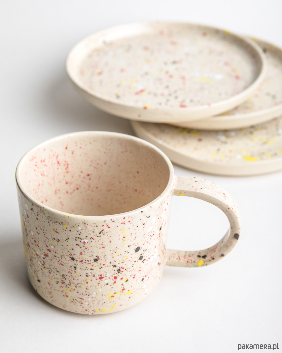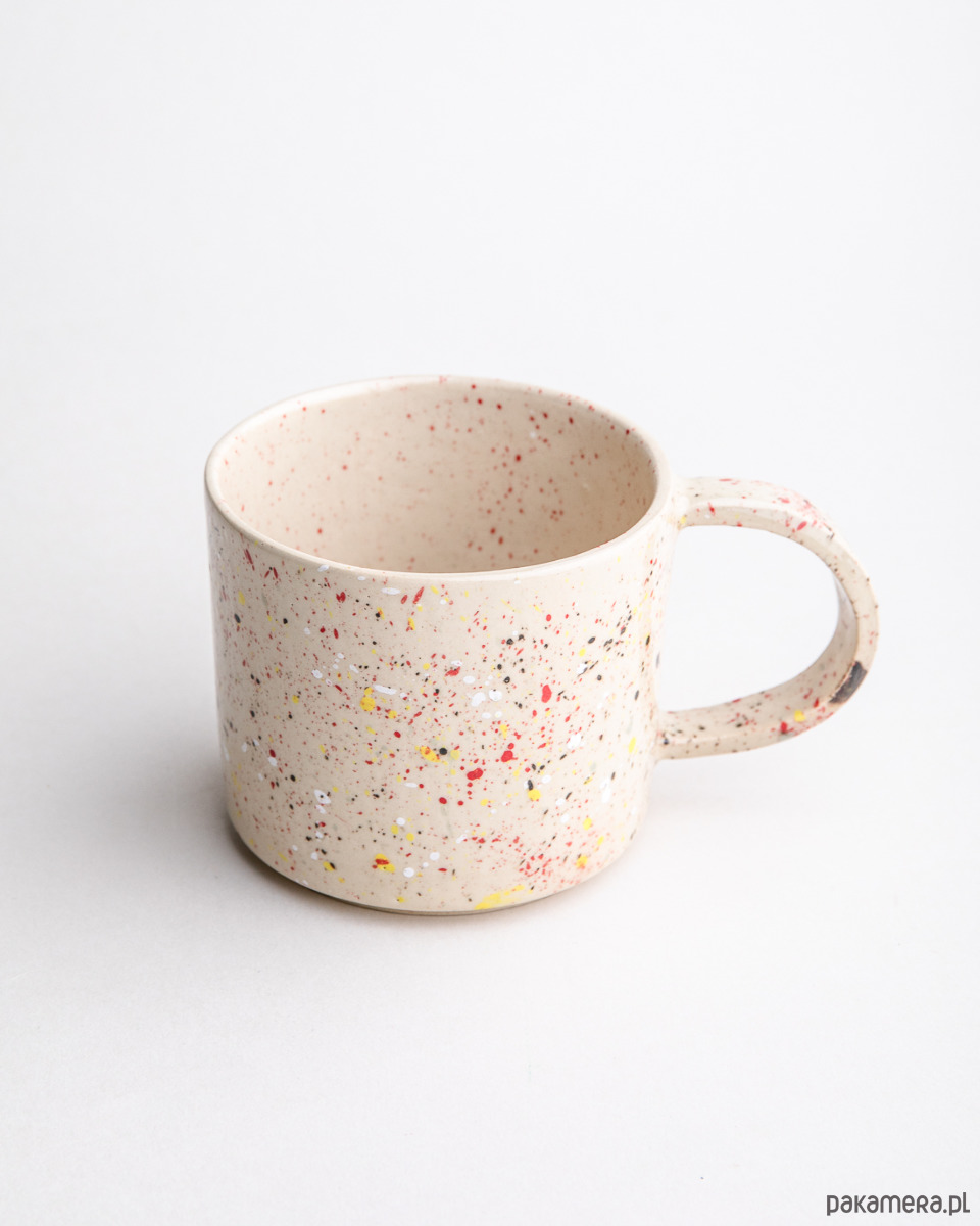 Kubki wykonane ręcznie z kremowej gliny, pochlapane farbą podszkliwną i pokryte szkliwem spożywczym przeznaczonym do kontaktu z żywnością.