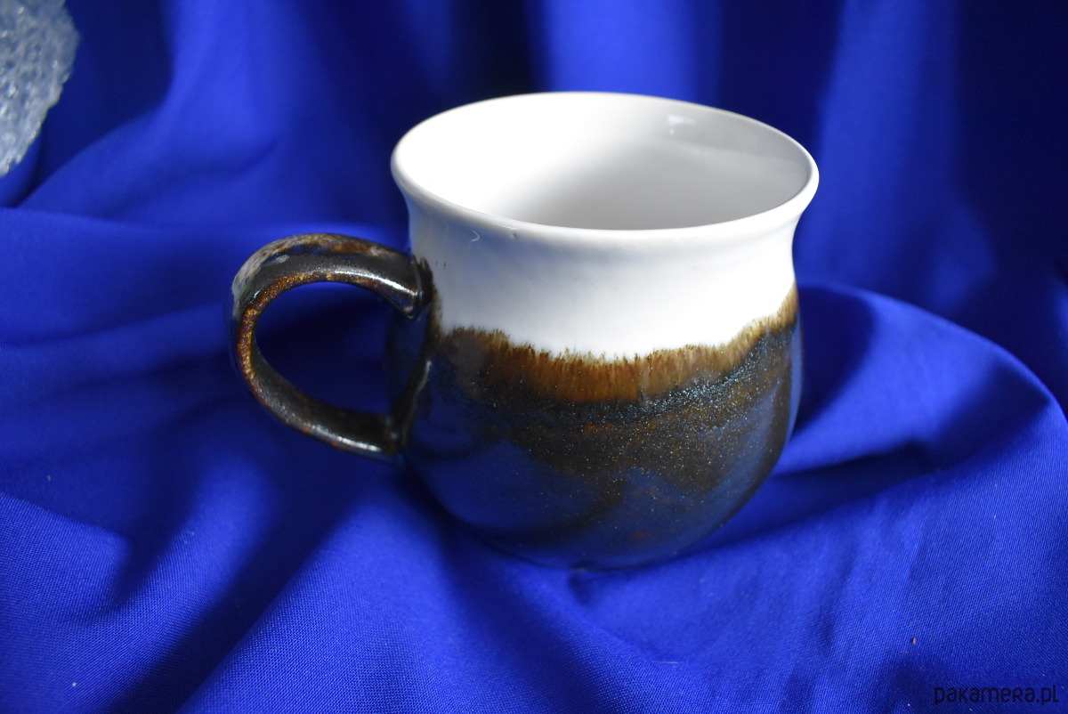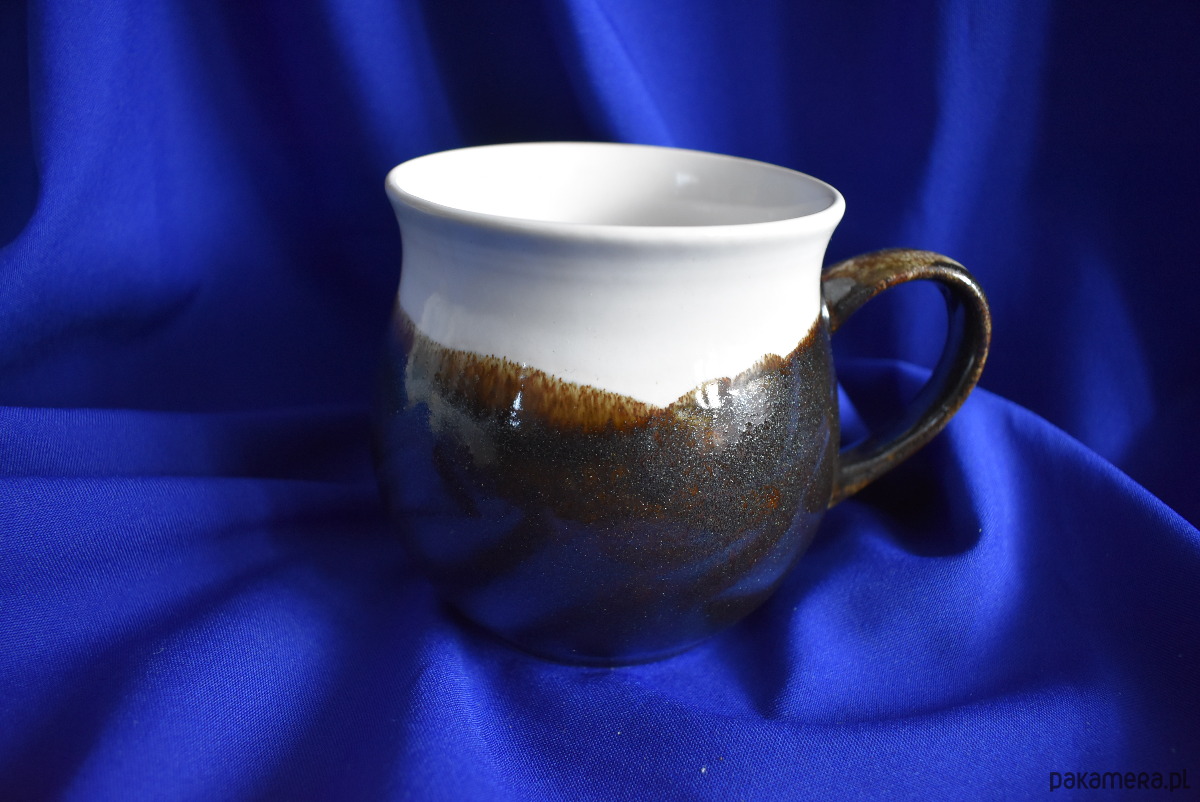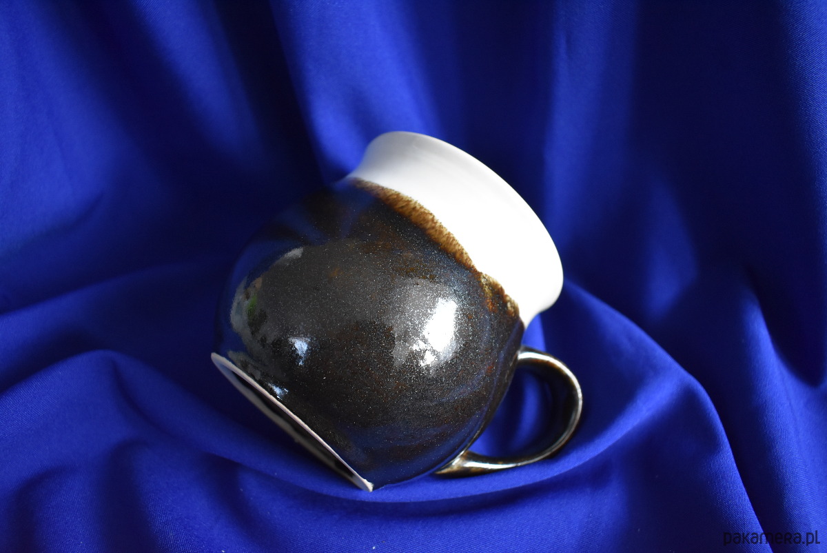 Ręcznie malowany kubek ceramiczny utrzymany w zestawieniu bieli i mieniącego się brązu. Przejścia między kolorami nadają mu unikalny charakter.