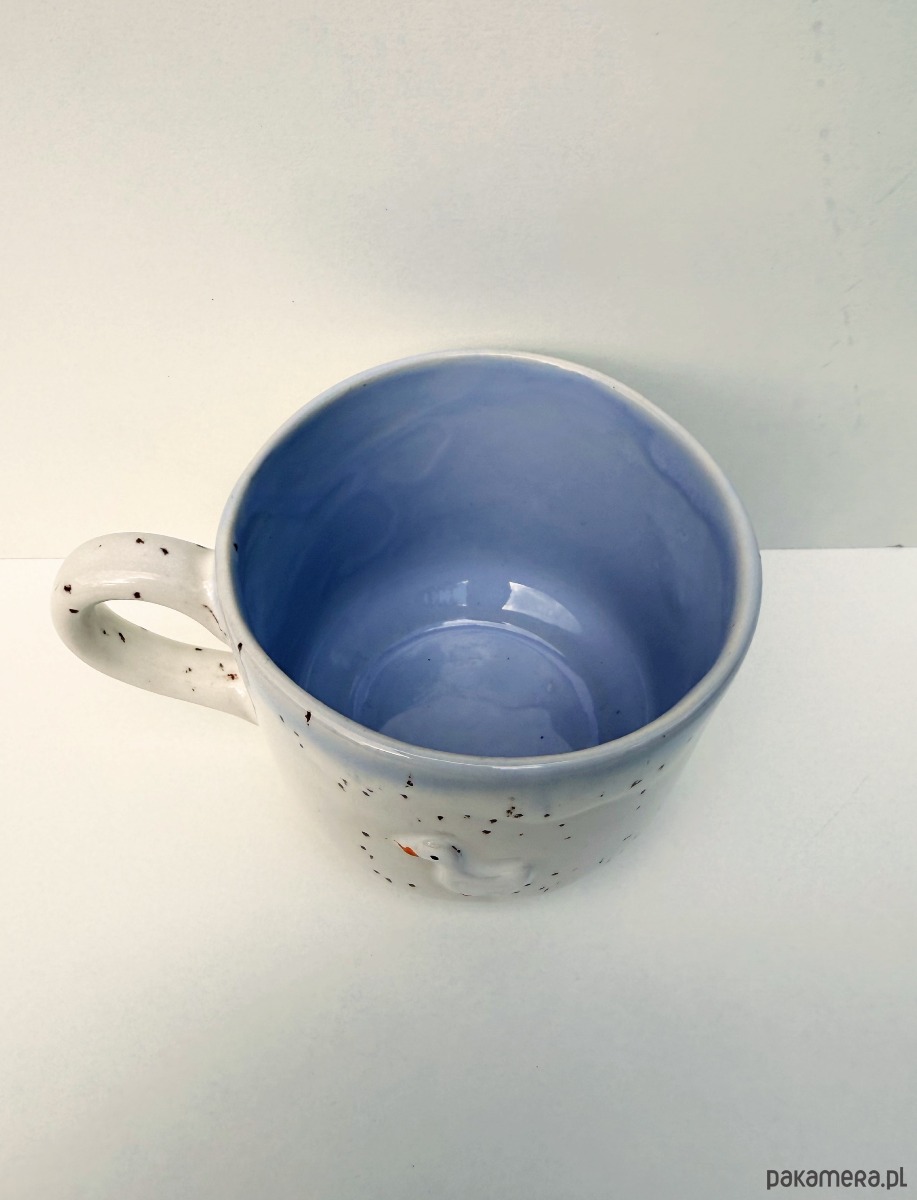 Kubek ceramiczny ręcznie wykonany w podpoznańskiej pracowni. Wewnątrz błękitne szkliwo, na zewnątrz białe nakrapiane. Sielskiego klimatu kubeczkowi dodaje mała gąska, która jest po obydwu stronach kubeczka - dla prawo i leworęcznych.