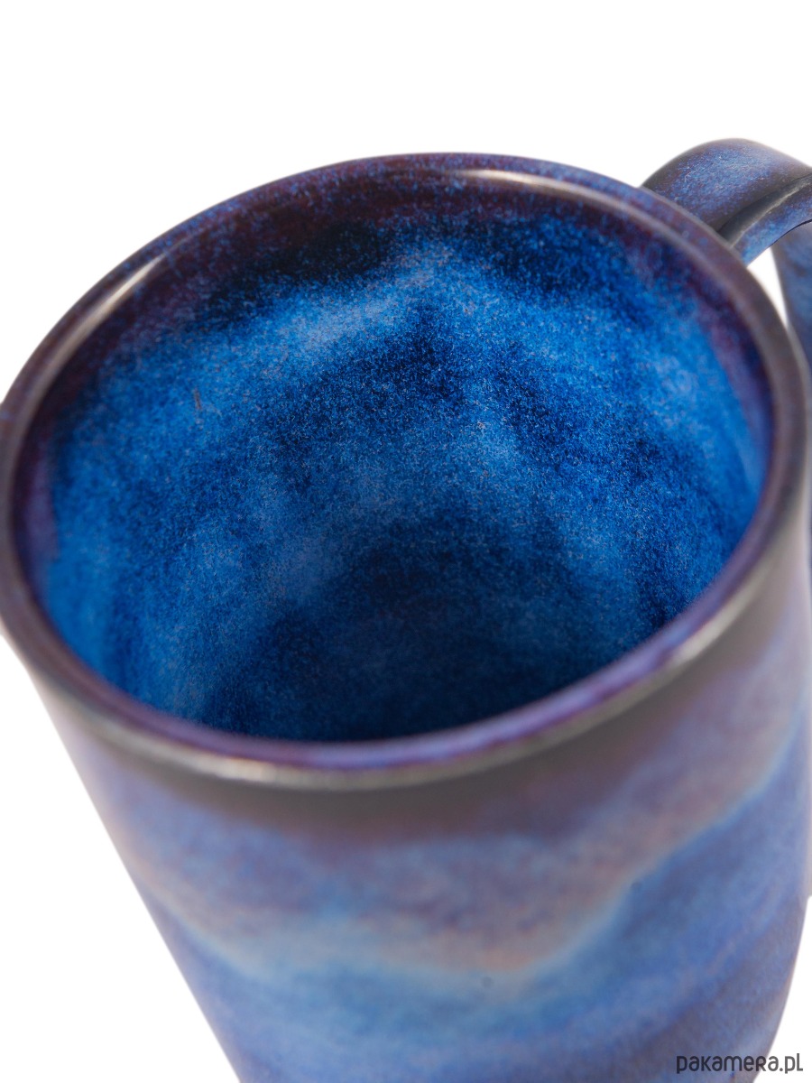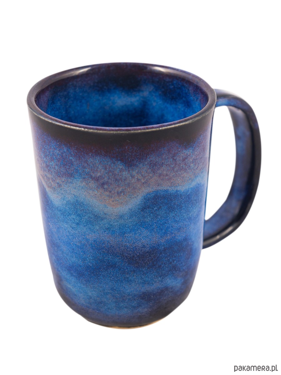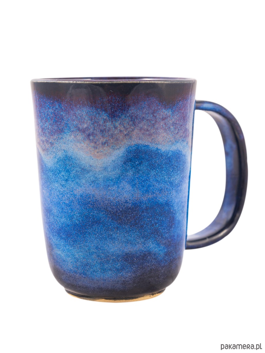 Kubek wykonany ręcznie z gliny, szkliwiony w sposób inspirowany nocnym niebem i zimową aurą. Zewnętrzna powierzchnia utrzymana jest w głębokich odcieniach granatu, kobaltu i przygaszonego błękitu, które miękko przenikają się nawzajem, tworząc organiczną, falującą strukturę. Kolory przywodzą na myśl rozgwieżdżone niebo w mroźną noc lub spokojną, zimową ciszę.