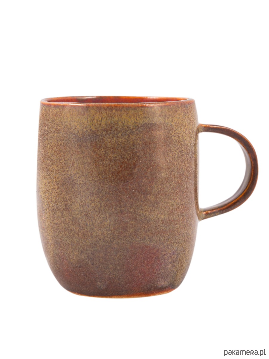 Kubek wykonany ręcznie z gliny, szkliwiony w subtelny, naturalny sposób, inspirowany barwami ziemi. Zewnętrzna powierzchnia utrzymana jest w ciepłych odcieniach brązu i ochry, które miękko przenikają się nawzajem, tworząc spokojną, organiczną strukturę.