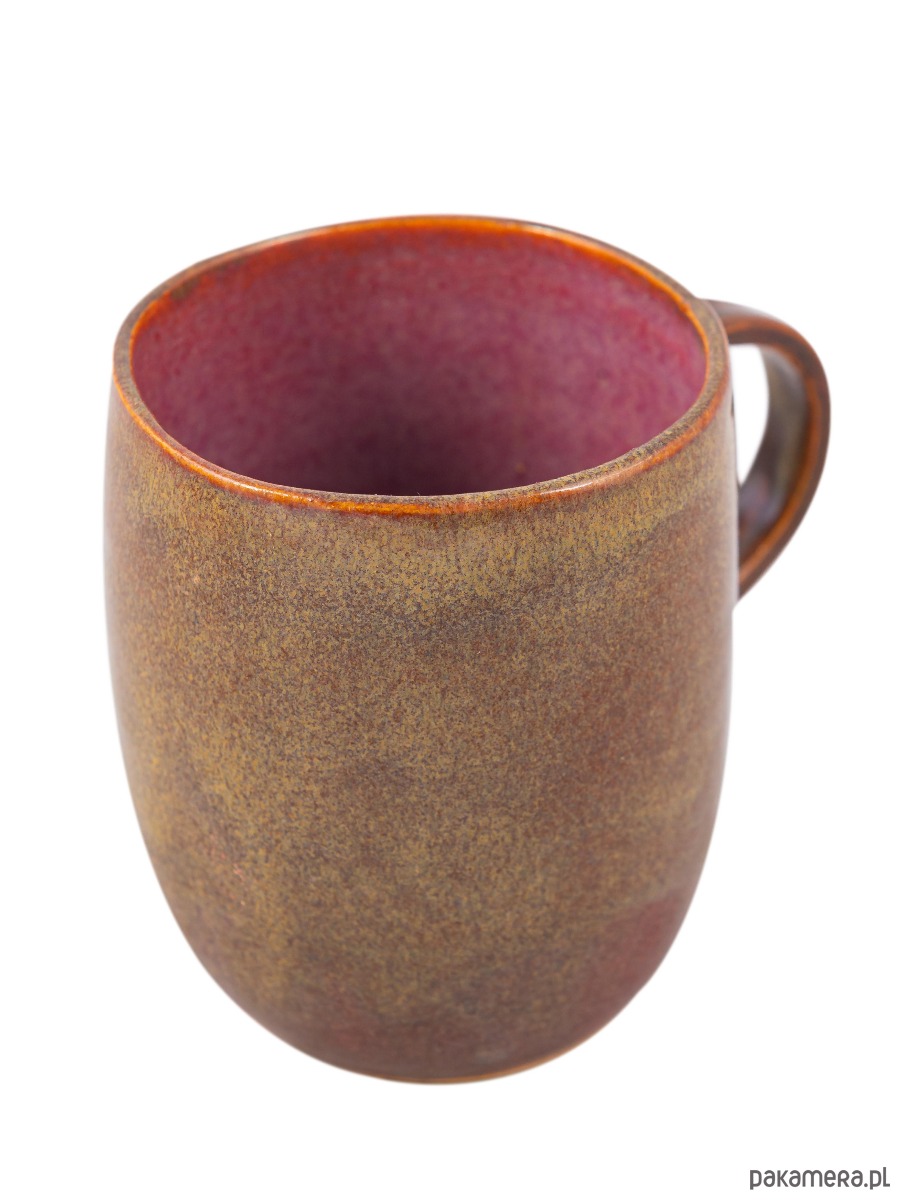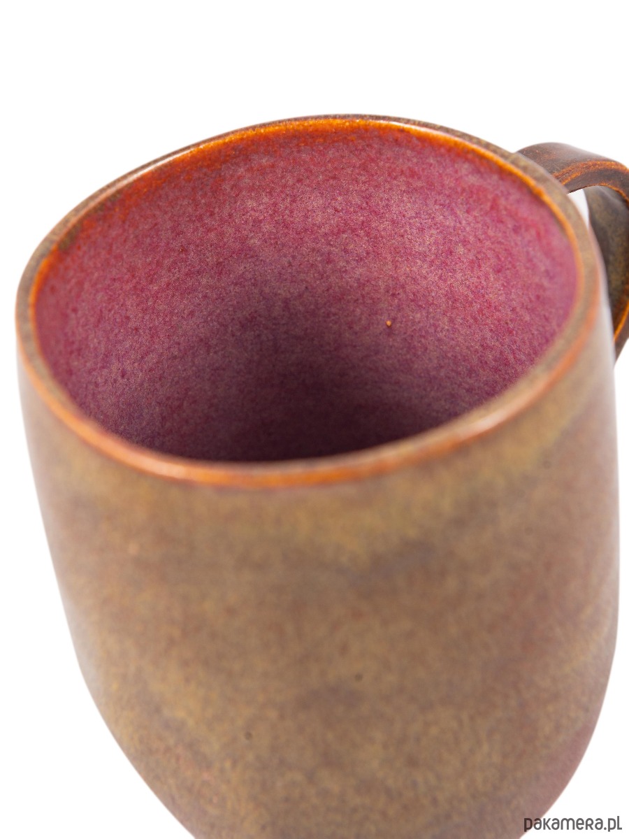Wnętrze kubka zaskakuje głębokim, malinowo-śliwkowym tonem z domieszką ciepłej czerwieni. Kontrast pomiędzy zewnętrzną, stonowaną powierzchnią a intensywnym kolorem środka nadaje całości wyjątkowej głębi i charakteru. Cienka linia szkliwa na krawędzi subtelnie łączy oba kolory.