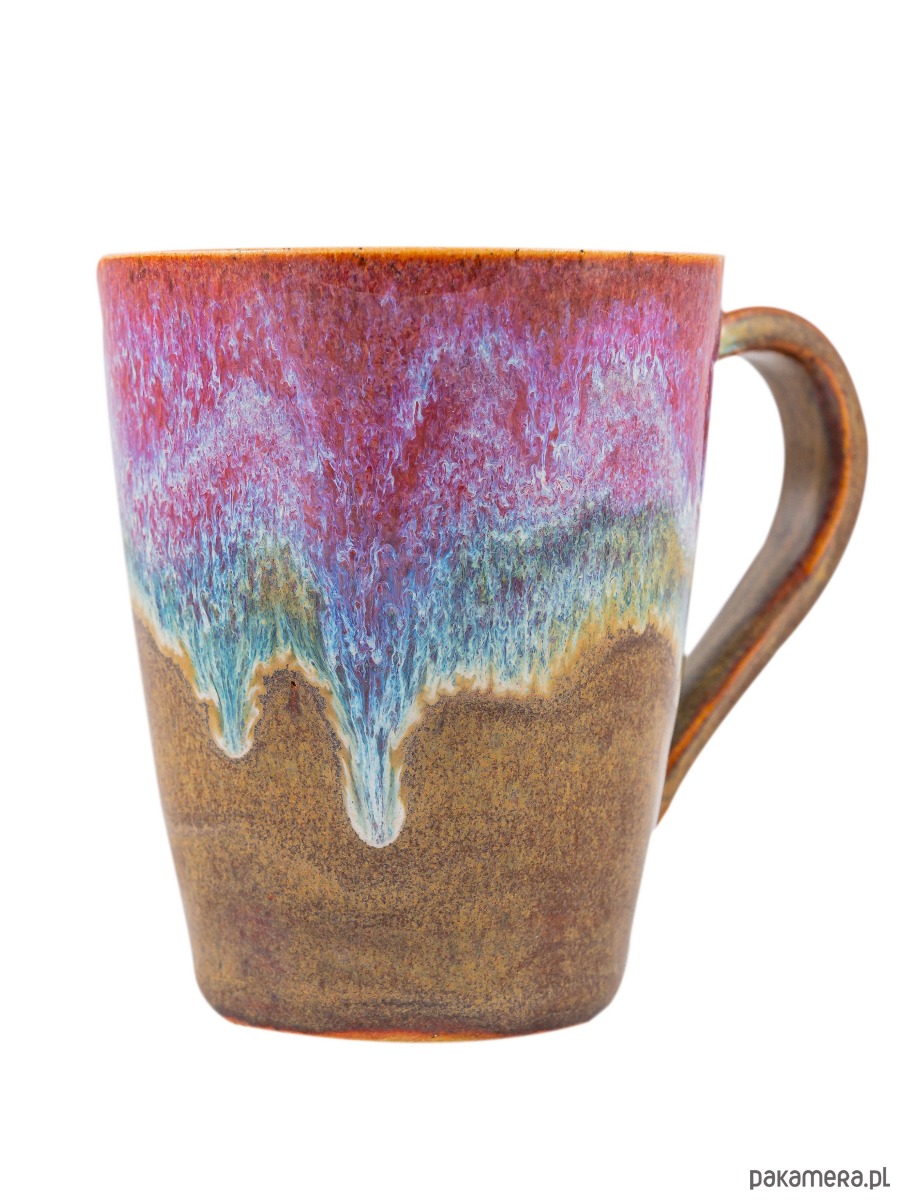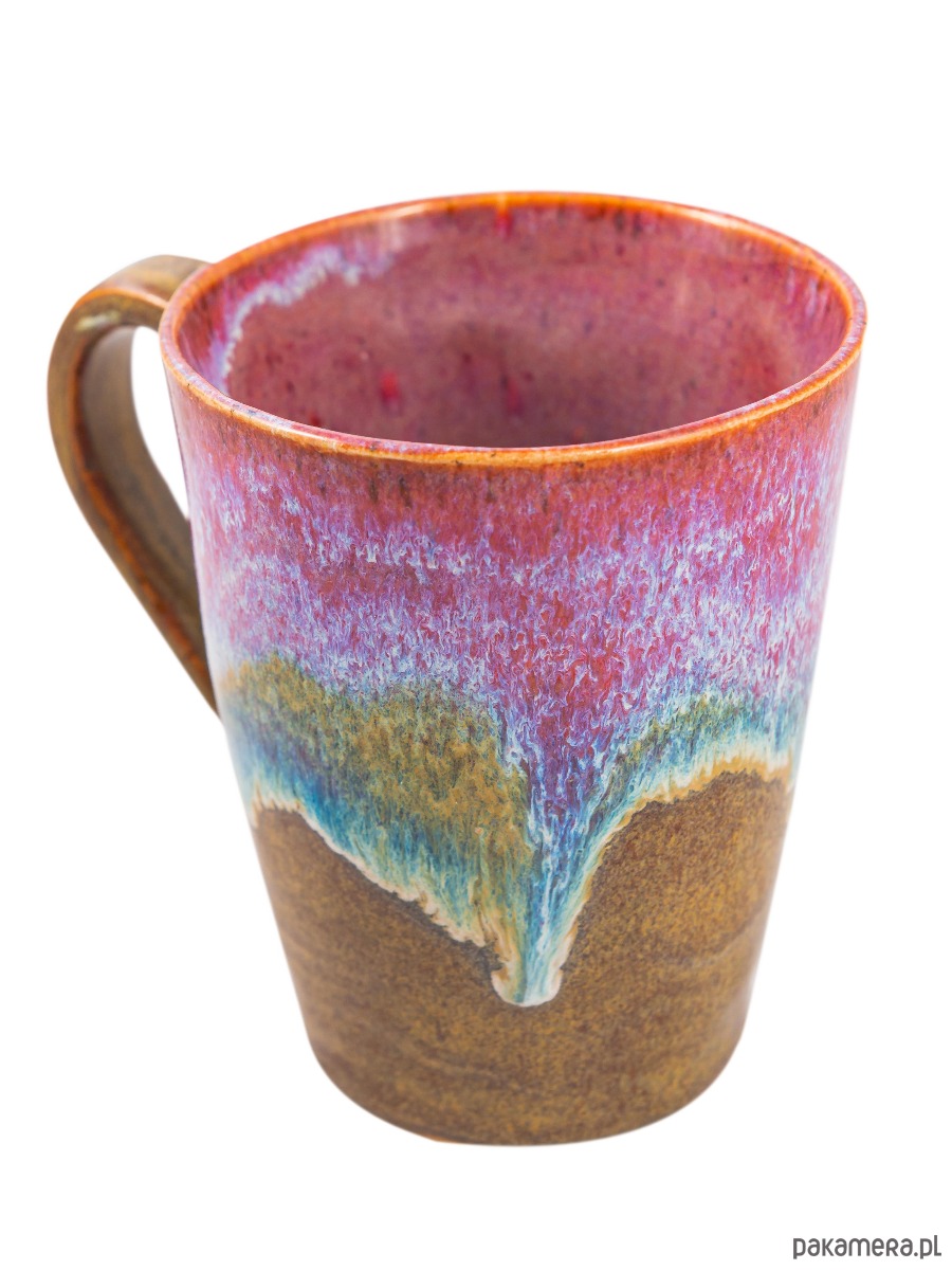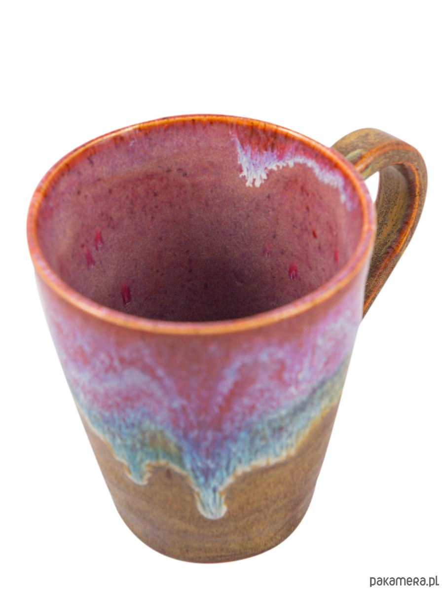 Kubek wykonany ręcznie z gliny, szkliwiony w unikalny, wielobarwny sposób. Górna część zachwyca głębokimi odcieniami malinowego różu i ciepłej czerwieni, które płynnie przechodzą w chłodniejsze tony turkusu i błękitu. Szkliwo spływa swobodnie ku dołowi, tworząc organiczne przejścia kolorystyczne, przypominające krajobraz. Dolna część kubka pozostaje w spokojnym, ziemistym brązie, podkreślając naturalny charakter ceramiki.