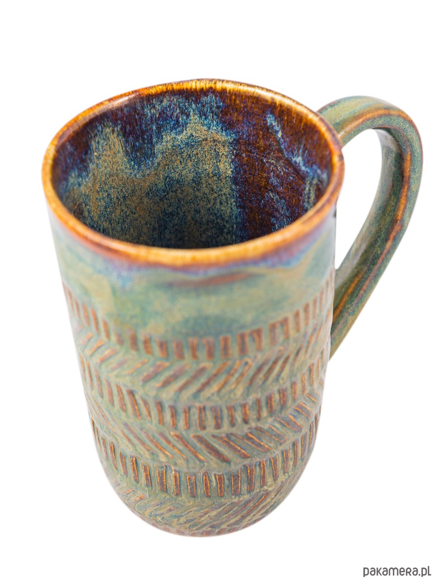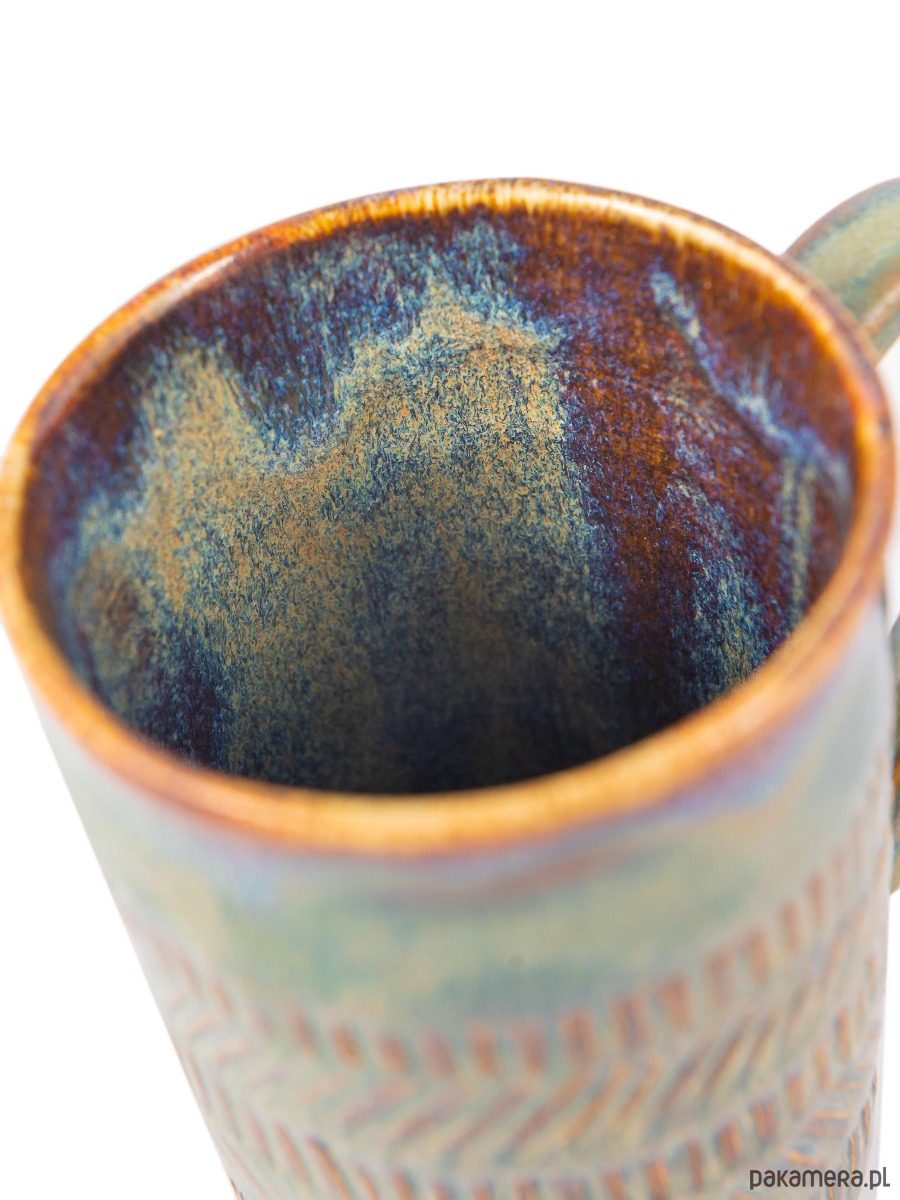 Każdy kubek powstaje w całości ręcznie, dlatego układ kolorów, intensywność szkliwa oraz sposób, w jaki osadza się ono w zagłębieniach struktury, mogą się subtelnie różnić. Te naturalne różnice sprawiają, że każdy egzemplarz jest unikatowy i niepowtarzalny.