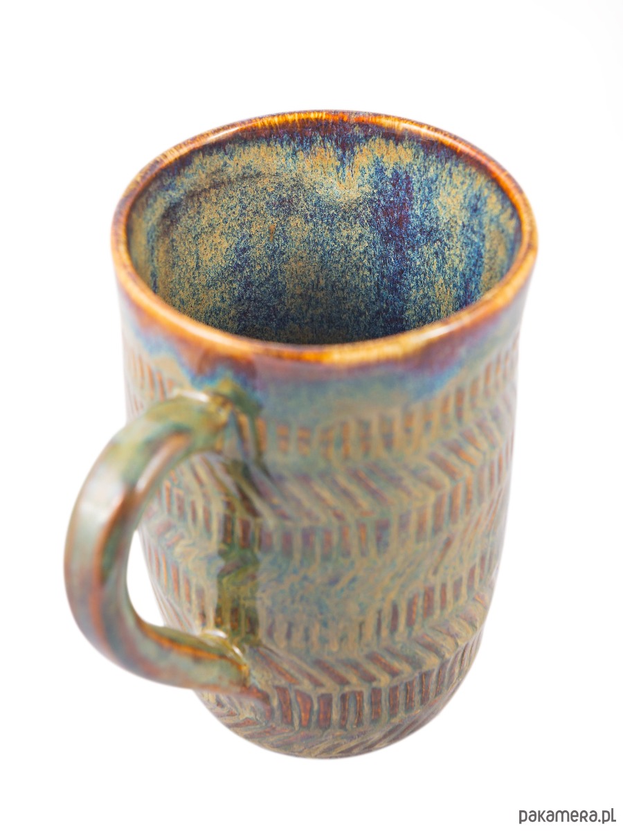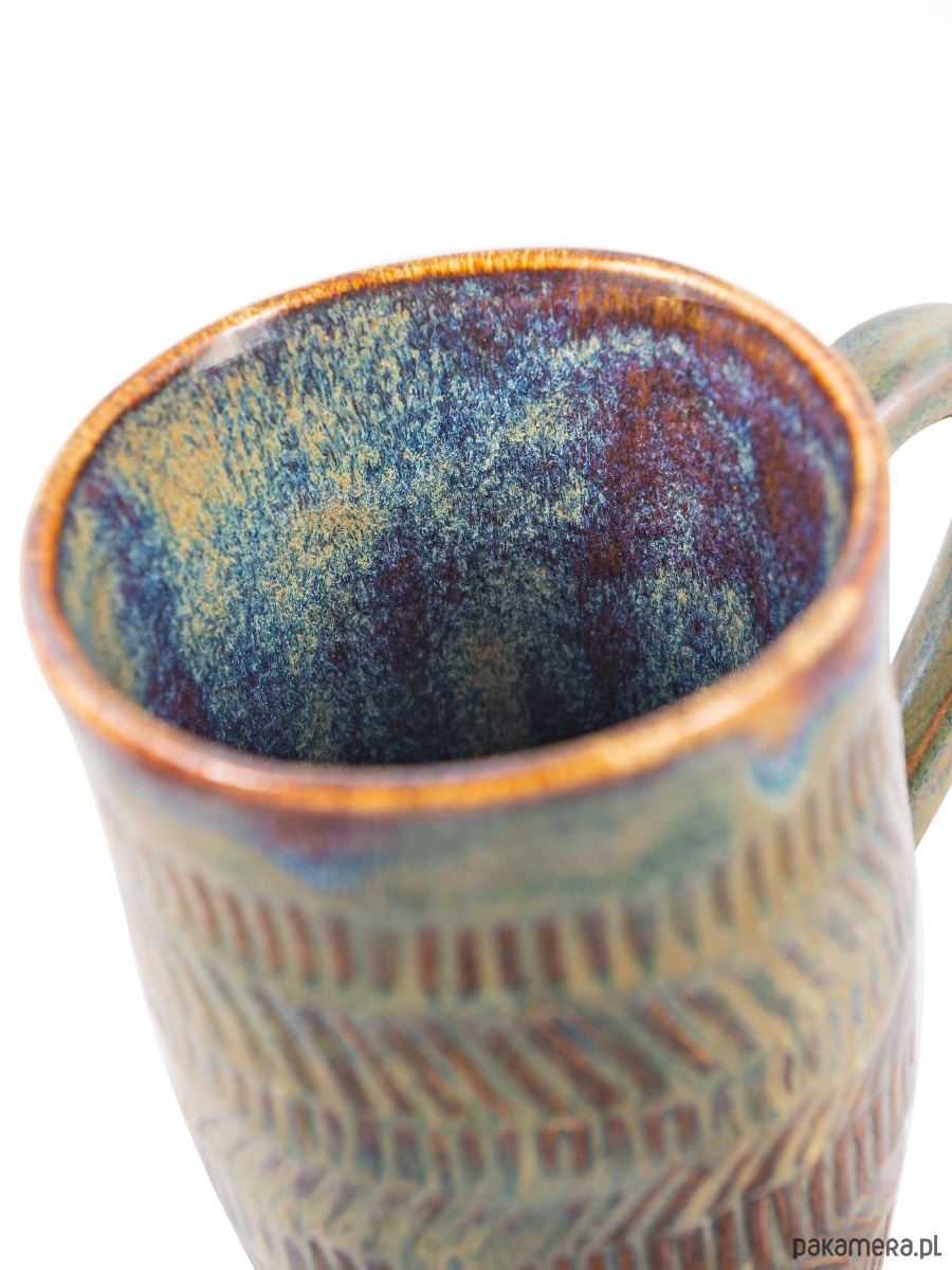 Każdy kubek powstaje w całości ręcznie, dlatego układ kolorów, intensywność szkliwa oraz sposób, w jaki osadza się ono w zagłębieniach struktury, mogą się subtelnie różnić. Te naturalne różnice sprawiają, że każdy egzemplarz jest unikatowy i niepowtarzalny.