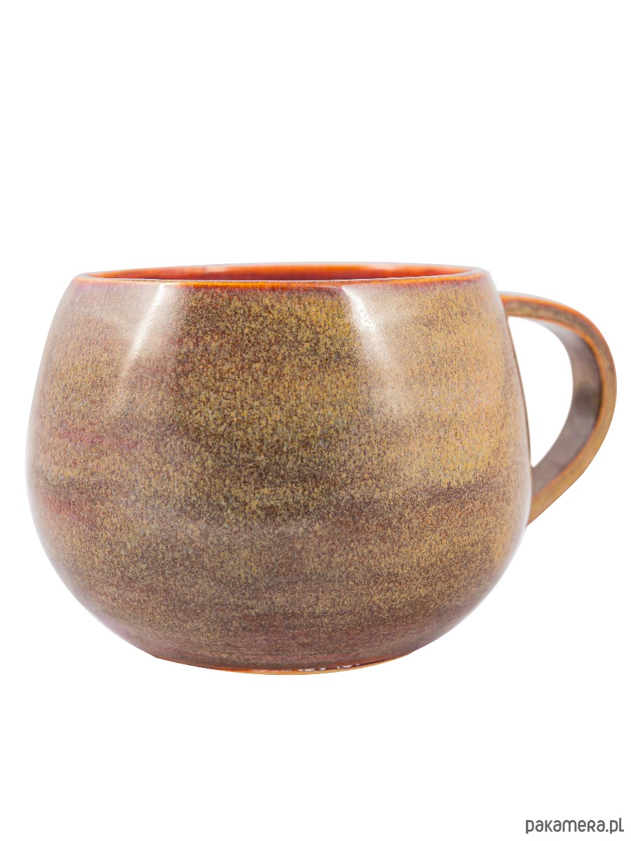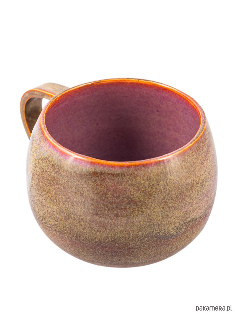 Kubek wykonany ręcznie z gliny, szkliwiony w subtelny, naturalny sposób, inspirowany barwami ziemi. Zewnętrzna powierzchnia utrzymana jest w ciepłych odcieniach brązu i ochry, które miękko przenikają się nawzajem, tworząc spokojną, organiczną strukturę.