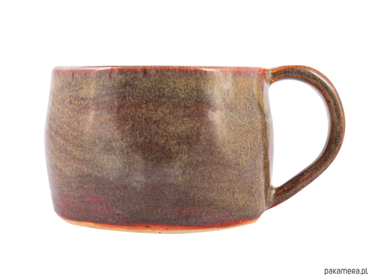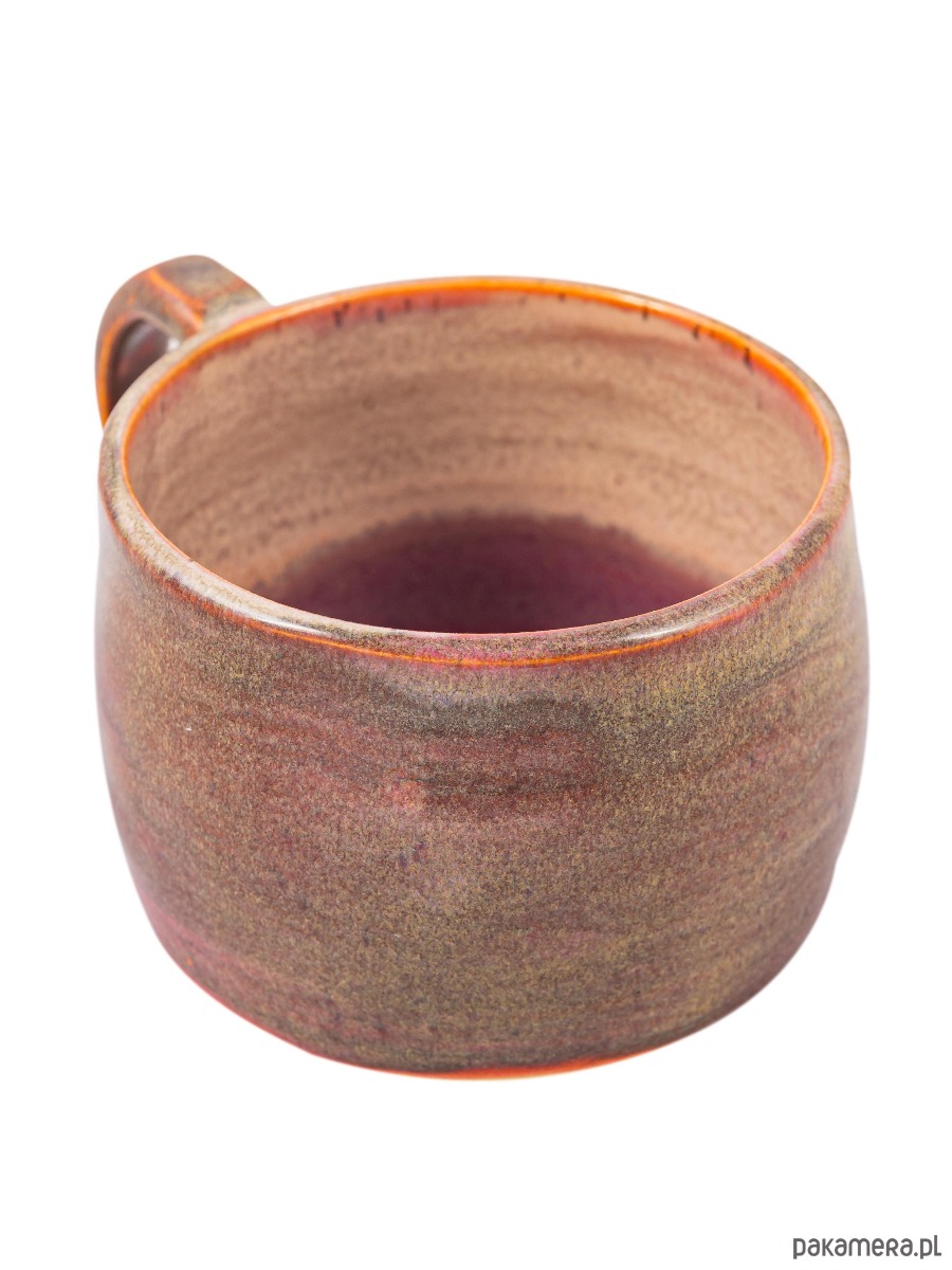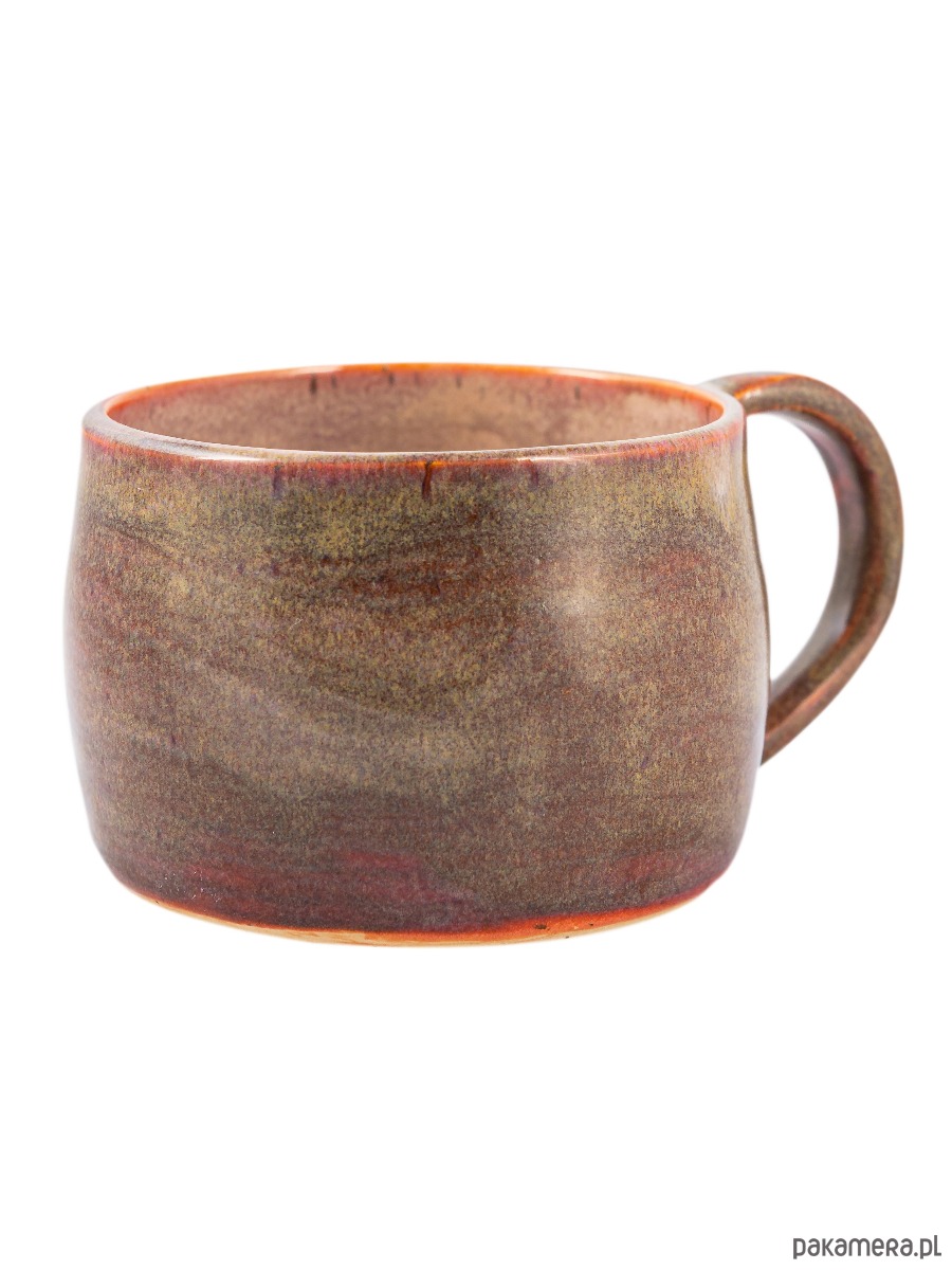 Kubek wykonany ręcznie z gliny, szkliwiony w subtelny, naturalny sposób, inspirowany barwami ziemi. Zewnętrzna powierzchnia utrzymana jest w ciepłych odcieniach brązu i ochry, z delikatnymi przejściami tonalnymi oraz lekko ziarnistą fakturą, która podkreśla surowy, rzemieślniczy charakter ceramiki.