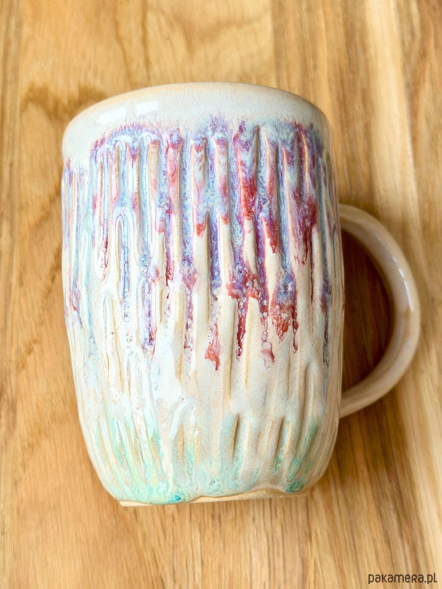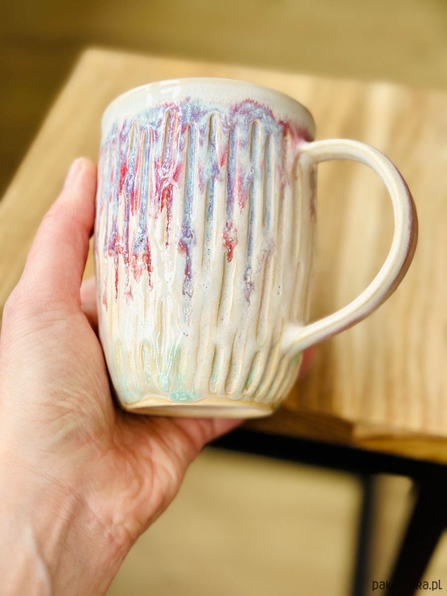 Kubek wykonany z jasnej gliny, inspirowany delikatnością lodów waniliowych z owocową polewą z leśnych jagód. Zewnętrzna powierzchnia przyciąga uwagę wyraźną, pionową fakturą, która nadaje formie rytm i charakter. Na kremowym, mlecznym tle szkliwa pojawiają się swobodnie spływające akcenty w odcieniach malinowego różu, jagodowego fioletu oraz chłodnego błękitu – niczym owocowa polewa powoli topniejąca na lodach.